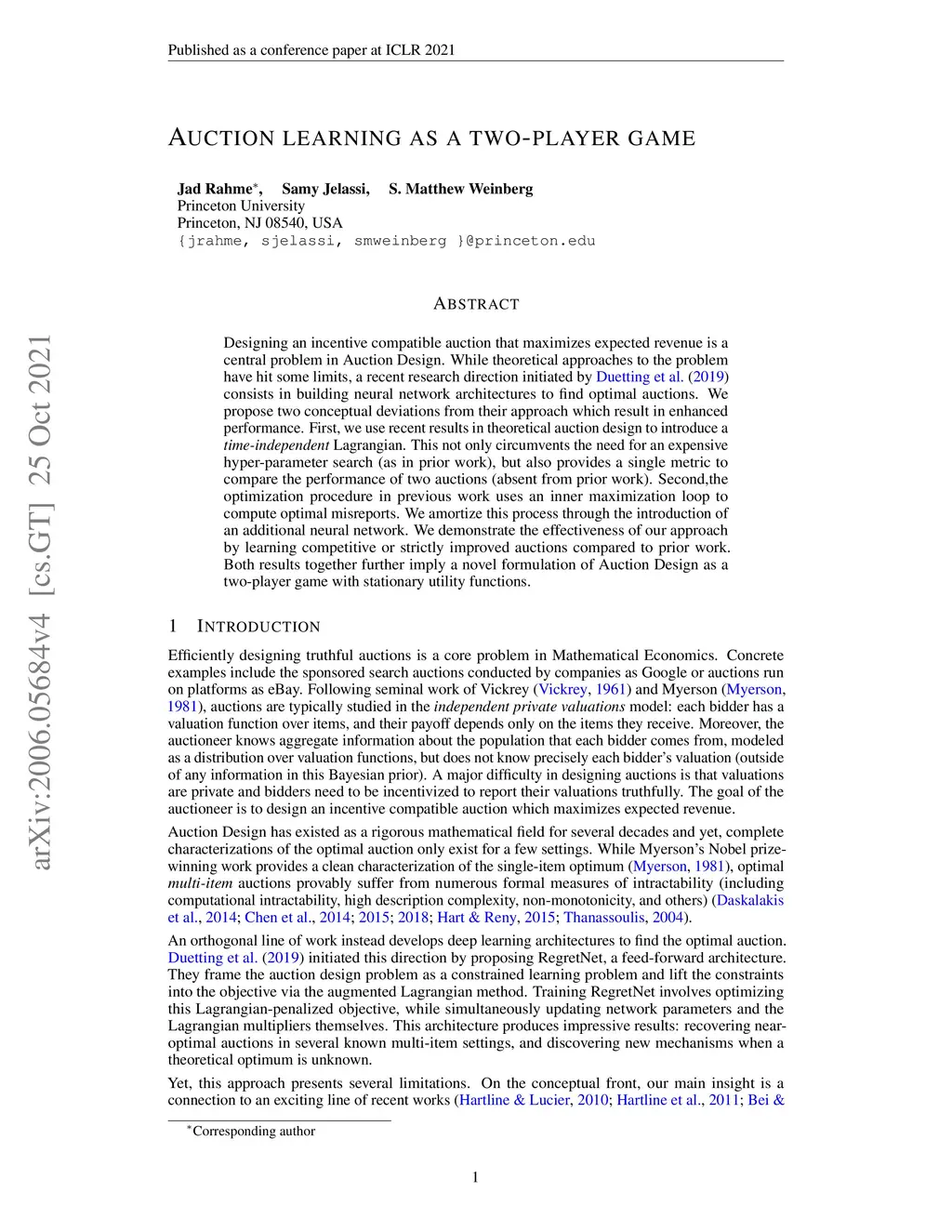 Designing an incentive compatible auction that maximizes expected revenue is a centralproblem in Auction Design. While theoretical approaches to the problem have hit some limits, arecent research direction initiated by Duetting et al. (2019) consists in building neural networkarchitectures to find optimal auctions. We propose two conceptual deviations from their approachwhich result in enhanced performance. First, we use recent results in theoretical auctiondesign (Rubinstein and Weinberg, 2018) to introduce atime-independentLagrangian. This notonly circumvents the need for an expensive hyper-parameter search (as in prior work), but alsoprovides a principled metric to compare the performance of two auctions (absent from priorwork). Second,the optimization procedure in previous work uses an inner maximization loop tocompute optimal misreports. We amortize this process through the introduction of an additionalneural network. We demonstrate the effectiveness of our approach by learning competitive orstrictly improved auctions compared to prior work. Both results together further imply a novelformulation of Auction Design as a two-player game with stationary utility functions.