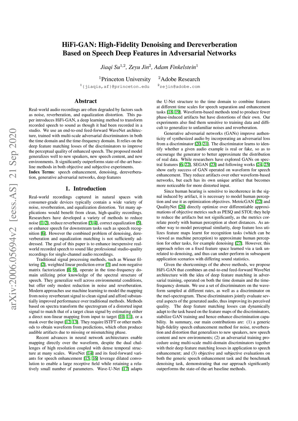 Real-world audio recordings are often degraded by factors such as noise, reverberation, and equalization distortion. This paper introduces HiFi-GAN, a deep learning method to transform recorded speech to sound as though it had been recorded in a studio. We use an end-to-end feed-forward WaveNet architecture, trained with multi-scale adversarial discriminators in both the time domain and the time-frequency domain. It relies on the deep feature matching losses of the discriminators to improve the perceptual quality of enhanced speech. The proposed model generalizes well to new speakers, new speech content, and new environments. It significantly outperforms state-of-the-art baseline methods in both objective and subjective experiments.