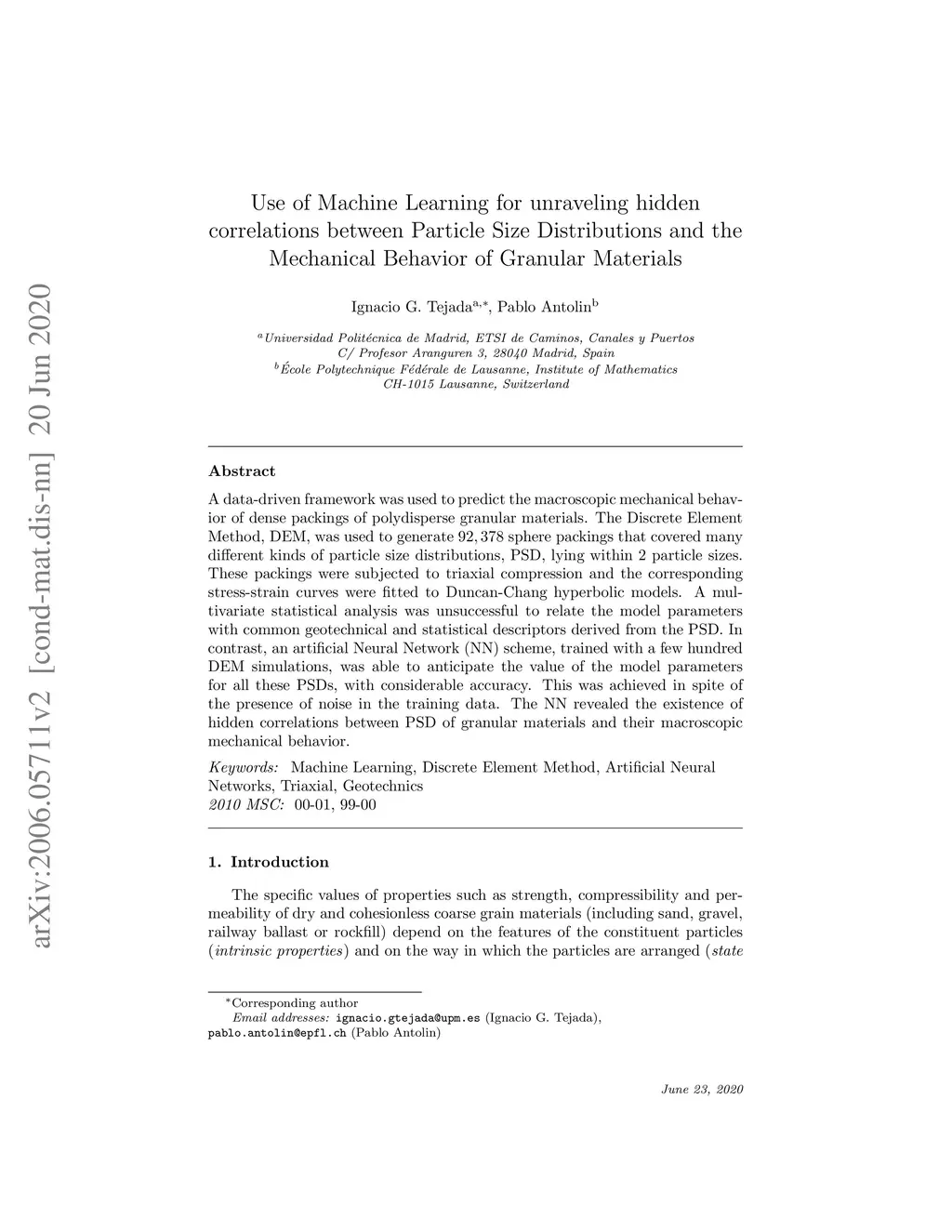 A data-driven framework was used to predict the macroscopic mechanical behavior of dense packings of polydisperse granular materials. The Discrete Element Method, DEM, was used to generate 92,378 sphere packings that covered many different kinds of particle size distributions, PSD, lying within 2 particle sizes. These packings were subjected to triaxial compression and the corresponding stress-strain curves were fitted to Duncan-Chang hyperbolic models. A multivariate statistical analysis was unsuccessful to relate the model parameters with common geotechnical and statistical descriptors derived from the PSD. In contrast, an artificial Neural Network (NN) scheme, trained with a few hundred DEM simulations, was able to anticipate the value of the model parameters for all these PSDs, with considerable accuracy. This was achieved in spite of the presence of noise in the training data. The NN revealed the existence of hidden correlations between PSD of granular materials and their macroscopic mechanical behavior.