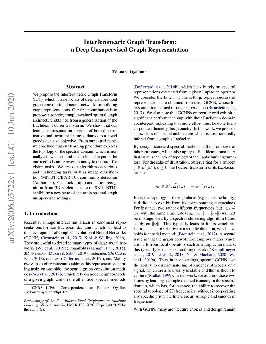 We propose the Interferometric Graph Transform (IGT), which is a new class of deep unsupervised graph convolutional neural network for building graph representations. Our first contribution is to propose a generic, complex-valued spectral graph architecture obtained from a generalization of the Euclidean Fourier transform. We show that our learned representation consists of both discriminative and invariant features, thanks to a novel greedy concave objective. From our experiments, we conclude that our learning procedure exploits the topology of the spectral domain, which is normally a flaw of spectral methods, and in particular our method can recover an analytic operator for vision tasks. We test our algorithm on various and challenging tasks such as image classification (MNIST, CIFAR-10), community detection (Authorship, Facebook graph) and action recognition from 3D skeletons videos (SBU, NTU), exhibiting a new state-of-the-art in spectral graph unsupervised settings.