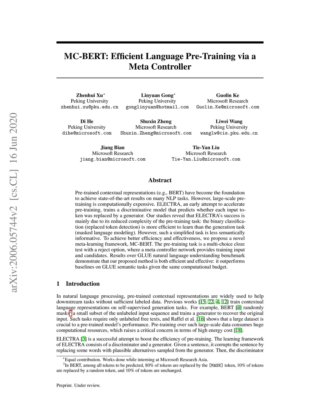 MC-BERT: Efficient Language Pre-Training via a Meta Controller