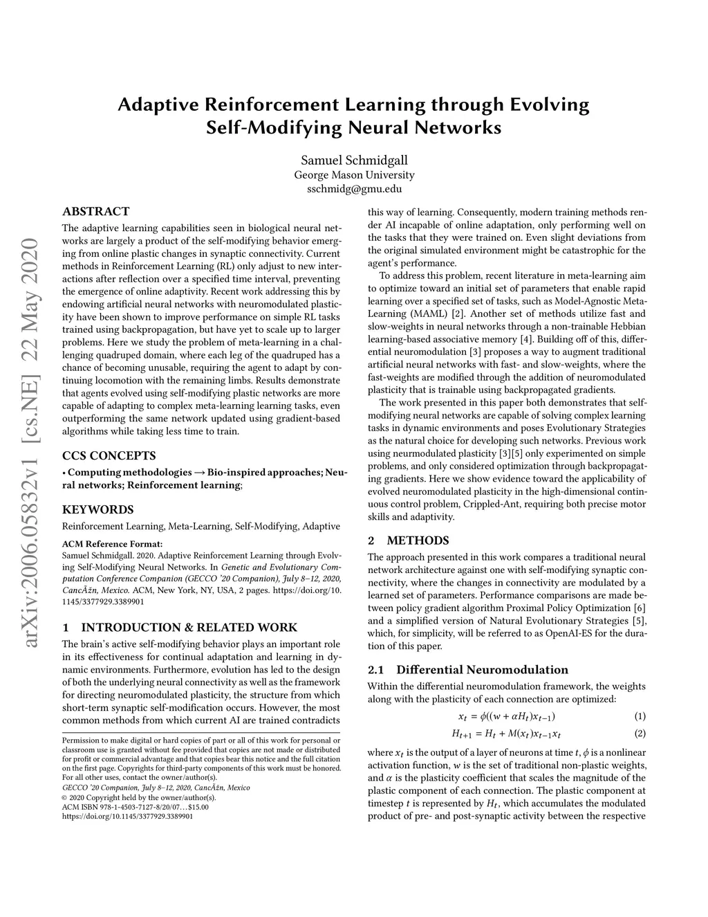 The adaptive learning capabilities seen in biological neural networks are largely a product of the self-modifying behavior emerging from online plastic changes in synaptic connectivity. Current methods in Reinforcement Learning (RL) only adjust to new interactions after reflection over a specified time interval, preventing the emergence of online adaptivity. Recent work addressing this by endowing artificial neural networks with neuromodulated plasticity have been shown to improve performance on simple RL tasks trained using backpropagation, but have yet to scale up to larger problems. Here we study the problem of meta-learning in a challenging quadruped domain, where each leg of the quadruped has a chance of becoming unusable, requiring the agent to adapt by continuing locomotion with the remaining limbs. Results demonstrate that agents evolved using self-modifying plastic networks are more capable of adapting to complex meta-learning learning tasks, even outperforming the same network updated using gradient-based algorithms while taking less time to train.