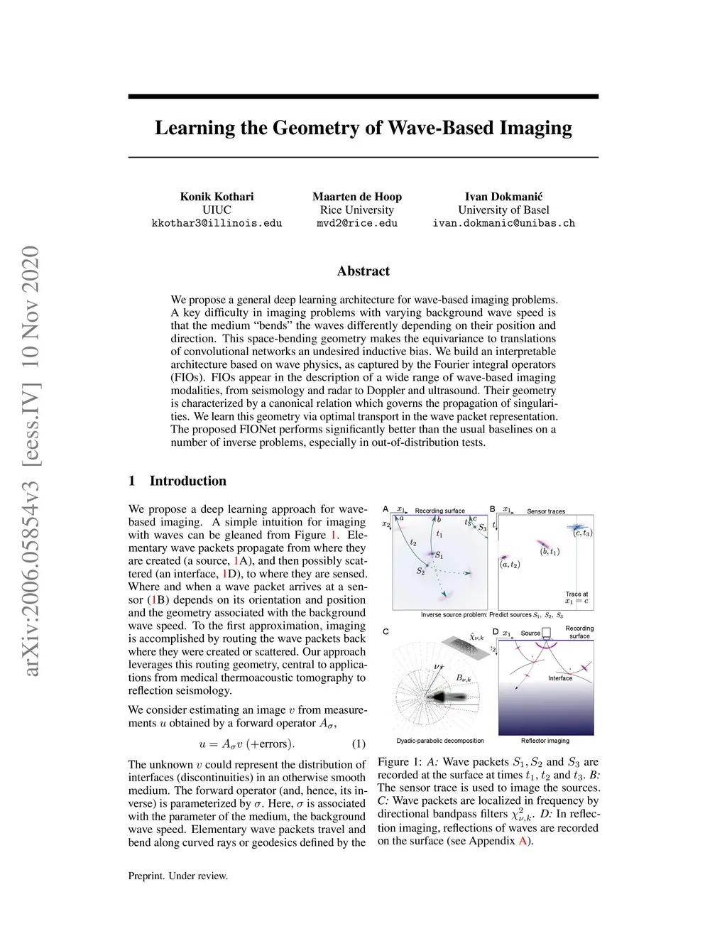We propose a general physics-based deep learning architecture for wave-based imaging problems. A key difficulty in imaging problems with a varying background wave speed is that the medium "bends" the waves differently depending on their position and direction. This space-bending geometry makes the equivariance to translations of convolutional networks an undesired inductive bias. We build an interpretable neural architecture inspired by Fourier integral operators (FIOs) which approximate the wave physics. FIOs model a wide range of imaging modalities, from seismology and radar to Doppler and ultrasound. We focus on learning the geometry of wave propagation captured by FIOs, which is implicit in the data, via a loss based on optimal transport. The proposed FIONet performs significantly better than the usual baselines on a number of imaging inverse problems, especially in out-of-distribution tests.