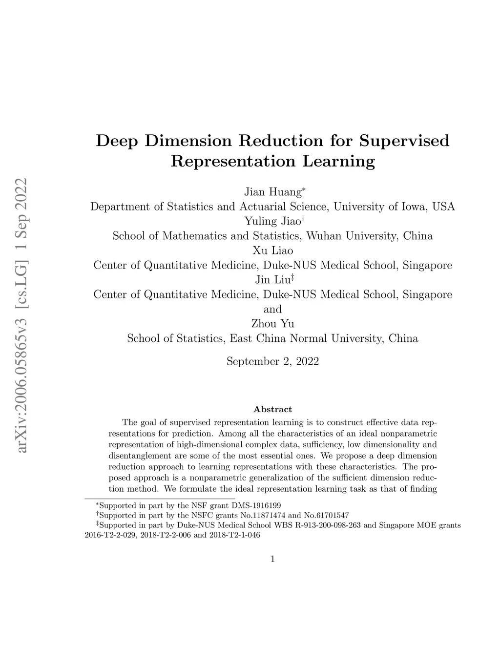 The goal of supervised representation learning is to construct effective data representations for prediction. Among all the characteristics of an ideal nonparametric representation of high-dimensional complex data, sufficiency, low dimensionality and disentanglement are some of the most essential ones. We propose a deep dimension reduction approach to learning representations with these characteristics. The proposed approach is a nonparametric generalization of the sufficient dimension reduction method. We formulate the ideal representation learning task as that of finding a nonparametric representation that minimizes an objective function characterizing conditional independence and promoting disentanglement at the population level. We then estimate the target representation at the sample level nonparametrically using deep neural networks. We show that the estimated deep nonparametric representation is consistent in the sense that its excess risk converges to zero. Our extensive numerical experiments using simulated and real benchmark data demonstrate that the proposed methods have better performance than several existing dimension reduction methods and the standard deep learning models in the context of classification and regression.