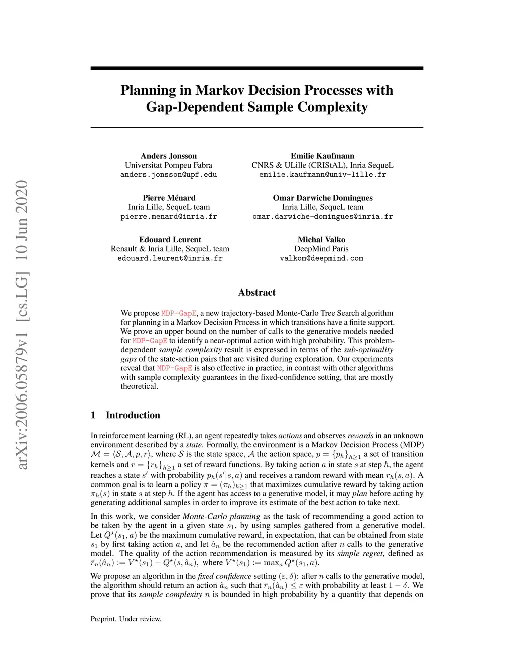 We propose MDP-GapE, a new trajectory-based Monte-Carlo Tree Search algorithm for planning in a Markov Decision Process in which transitions have a finite support. We prove an upper bound on the number of calls to the generative models needed for MDP-GapE to identify a near-optimal action with high probability. This problem-dependent sample complexity result is expressed in terms of the sub-optimality gaps of the state-action pairs that are visited during exploration. Our experiments reveal that MDP-GapE is also effective in practice, in contrast with other algorithms with sample complexity guarantees in the fixed-confidence setting, that are mostly theoretical.
