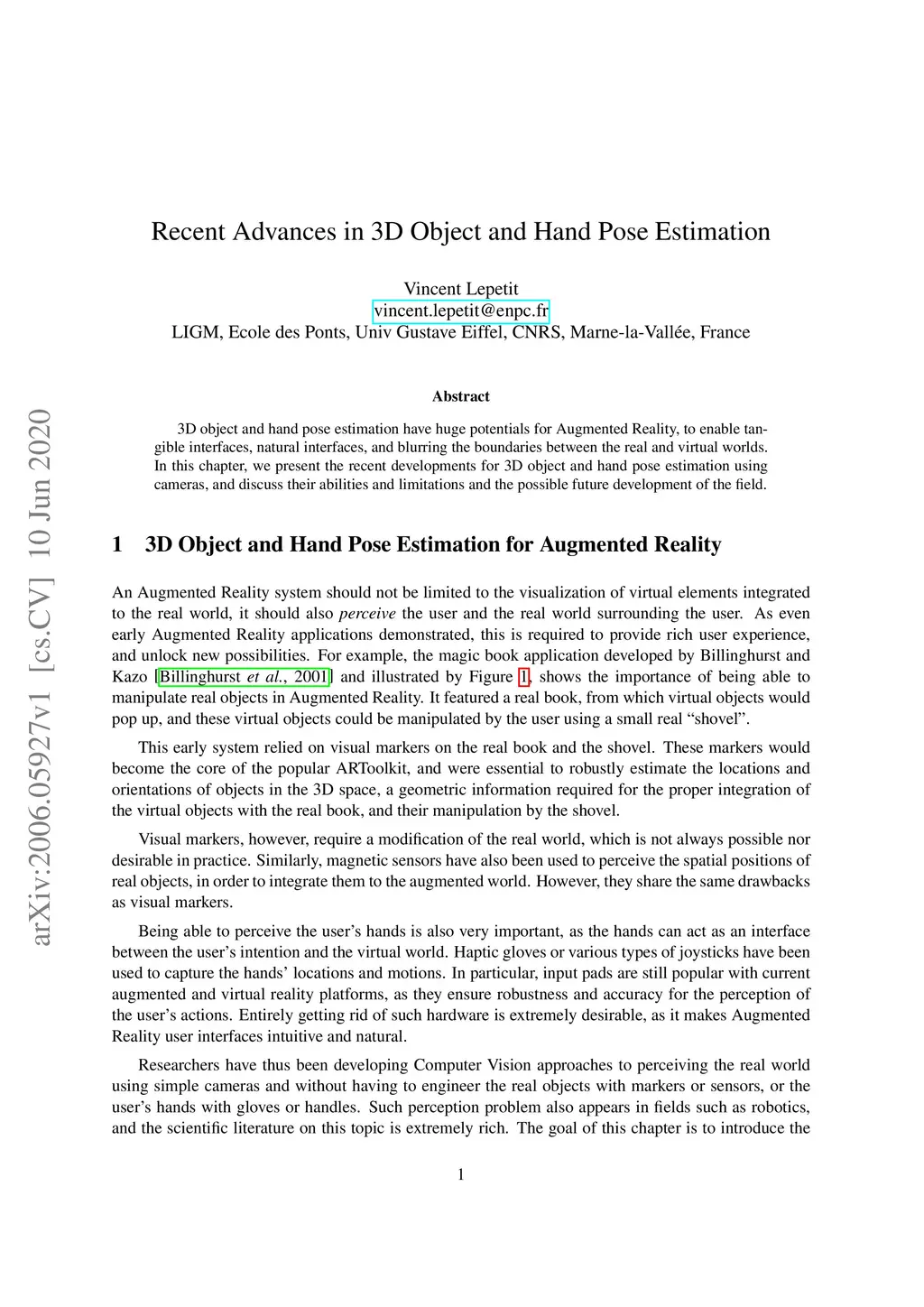 3D object and hand pose estimation have huge potentials for Augmented Reality, to enable tangible interfaces, natural interfaces, and blurring the boundaries between the real and virtual worlds. In this chapter, we present the recent developments for 3D object and hand pose estimation using cameras, and discuss their abilities and limitations and the possible future development of the field.
