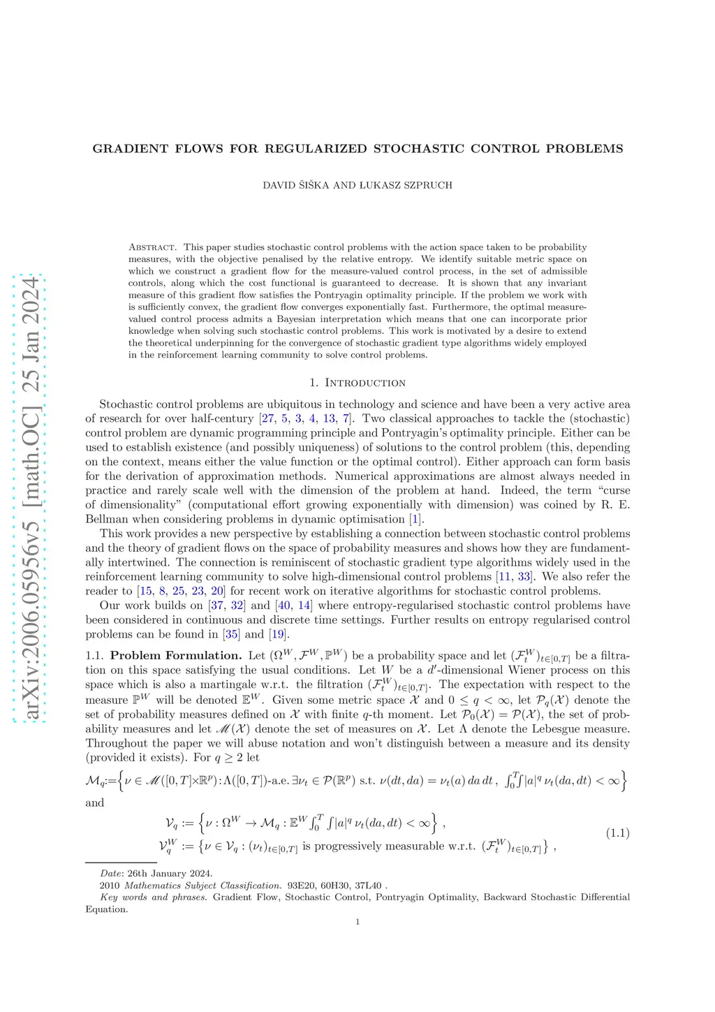 This paper studies stochastic control problems with the action space taken to be probability measures, with the objective penalised by the relative entropy. We identify suitable metric space on which we construct a gradient flow for the measure-valued control process, in the set of admissible controls, along which the cost functional is guaranteed to decrease. It is shown that any invariant measure of this gradient flow satisfies the Pontryagin optimality principle. If the problem we work with is sufficiently convex, the gradient flow converges exponentially fast. Furthermore, the optimal measure-valued control process admits a Bayesian interpretation which means that one can incorporate prior knowledge when solving such stochastic control problems. This work is motivated by a desire to extend the theoretical underpinning for the convergence of stochastic gradient type algorithms widely employed in the reinforcement learning community to solve control problems.