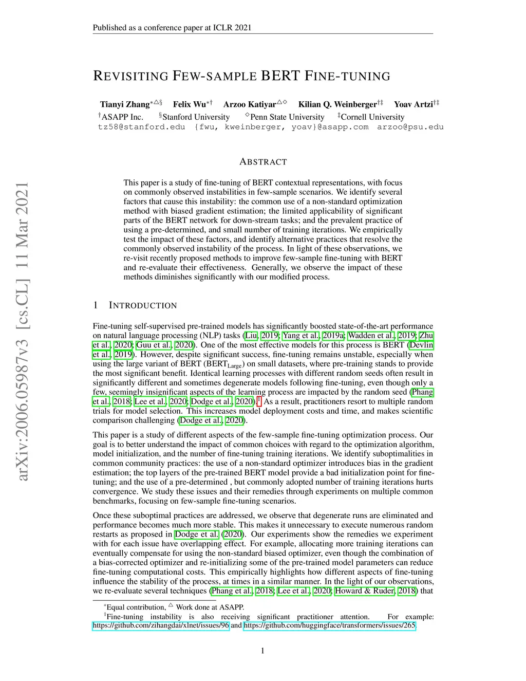 This paper is a study of fine-tuning of BERT contextual representations, with focus on commonly observed instabilities in few-sample scenarios. We identify several factors that cause this instability: the common use of a non-standard optimization method with biased gradient estimation; the limited applicability of significant parts of the BERT network for down-stream tasks; and the prevalent practice of using a pre-determined, and small number of training iterations. We empirically test the impact of these factors, and identify alternative practices that resolve the commonly observed instability of the process. In light of these observations, we re-visit recently proposed methods to improve few-sample fine-tuning with BERT and re-evaluate their effectiveness. Generally, we observe the impact of these methods diminishes significantly with our modified process.