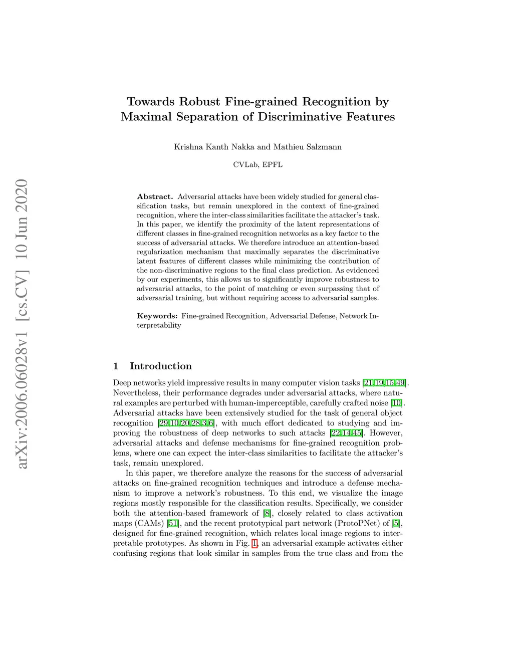 Adversarial attacks have been widely studied for general classification tasks, but remain unexplored in the context of fine-grained recognition, where the inter-class similarities facilitate the attacker's task. In this paper, we identify the proximity of the latent representations of different classes in fine-grained recognition networks as a key factor to the success of adversarial attacks. We therefore introduce an attention-based regularization mechanism that maximally separates the discriminative latent features of different classes while minimizing the contribution of the non-discriminative regions to the final class prediction. As evidenced by our experiments, this allows us to significantly improve robustness to adversarial attacks, to the point of matching or even surpassing that of adversarial training, but without requiring access to adversarial samples.