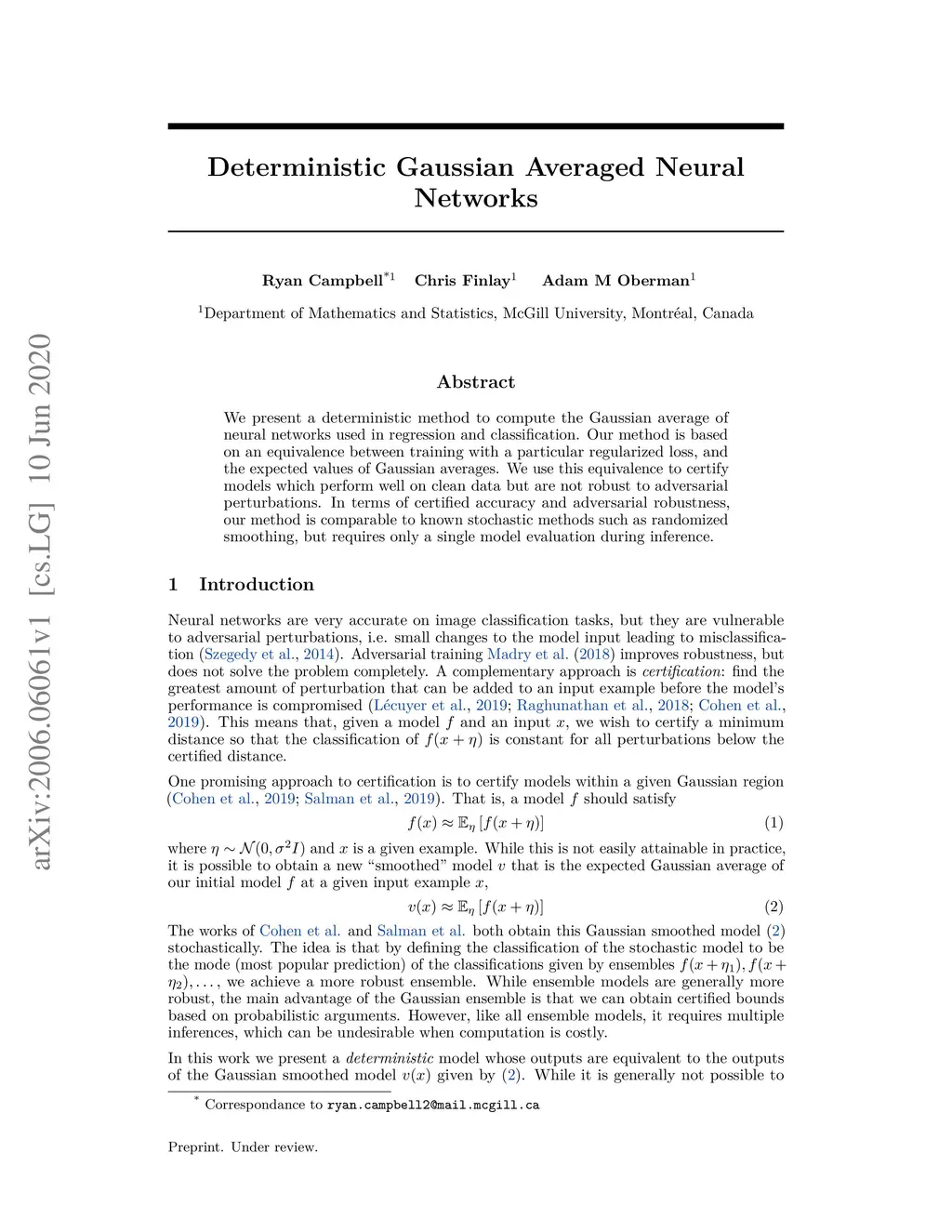 We present a deterministic method to compute the Gaussian average of neural networks used in regression and classification. Our method is based on an equivalence between training with a particular regularized loss, and the expected values of Gaussian averages. We use this equivalence to certify models which perform well on clean data but are not robust to adversarial perturbations. In terms of certified accuracy and adversarial robustness, our method is comparable to known stochastic methods such as randomized smoothing, but requires only a single model evaluation during inference.