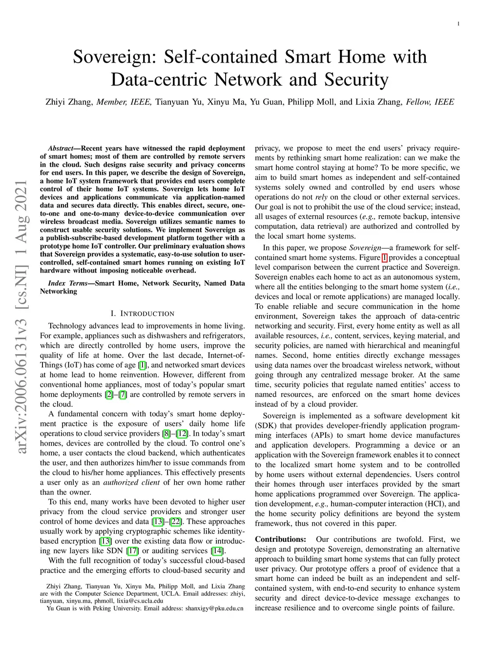 Smart homes made up of Internet of Things (IoT) devices have seen wide deployment in recent years, with most, if not all, of them controlled by remote servers in the cloud. Such designs raise security and privacy concerns for end users. We believe that the current situation has largely resulted from lacking a systematic home IoT framework to support localized end user control. To let end users take back the control of smart homes, we propose Sovereign, an IoT system framework that allows users to securely control home IoT systems without depending on a cloud backend. Unlike existing solutions, Sovereign networks home IoT devices and applications using named data with application-level semantics; the names are then used to construct security mechanisms. Users define security policies and these policies are then executed by the localized security modules. We implement Sovereign as a pub/sub based development platform together with a prototype local IoT controller. Our preliminary evaluation shows that Sovereign provides an easy-to-use systematic solution to secure smart homes under user control without imposing noticeable overhead.