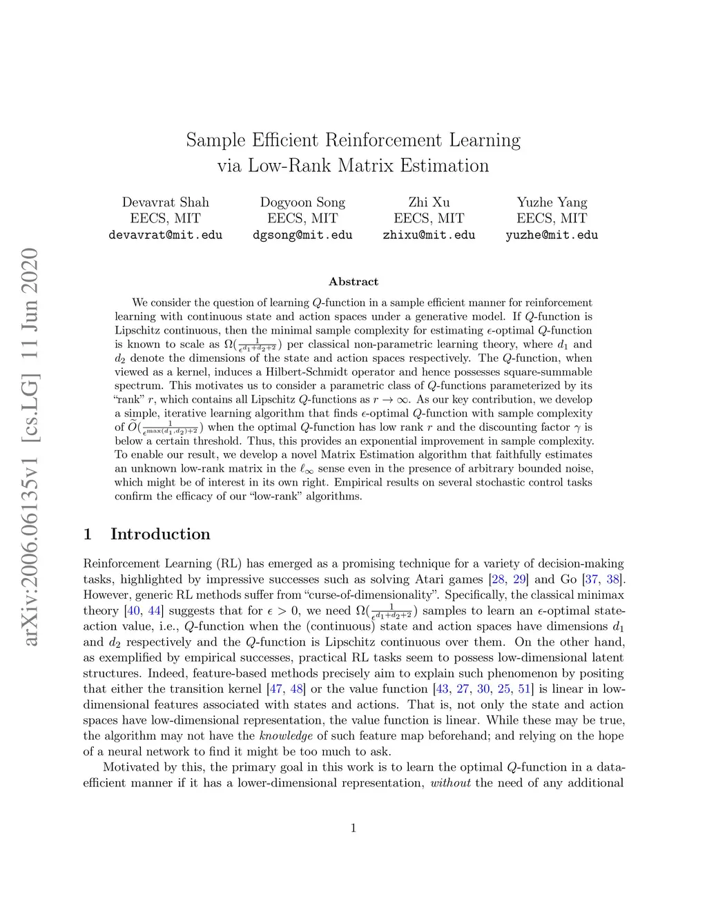 We consider the question of learning -function in a sample efficient manner for reinforcement learning with continuous state and action spaces under a generative model. If -function is Lipschitz continuous, then the minimal sample complexity for estimating -optimal -function is known to scale as per classical non-parametric learning theory, where and denote the dimensions of the state and action spaces respectively. The -function, when viewed as a kernel, induces a Hilbert-Schmidt operator and hence possesses square-summable spectrum. This motivates us to consider a parametric class of -functions parameterized by its "rank" , which contains all Lipschitz -functions as . As our key contribution, we develop a simple, iterative learning algorithm that finds -optimal -function with sample complexity of when the optimal -function has low rank and the discounting factor is below a certain threshold. Thus, this provides an exponential improvement in sample complexity. To enable our result, we develop a novel Matrix Estimation algorithm that faithfully estimates an unknown low-rank matrix in the sense even in the presence of arbitrary bounded noise, which might be of interest in its own right. Empirical results on several stochastic control tasks confirm the efficacy of our "low-rank" algorithms.