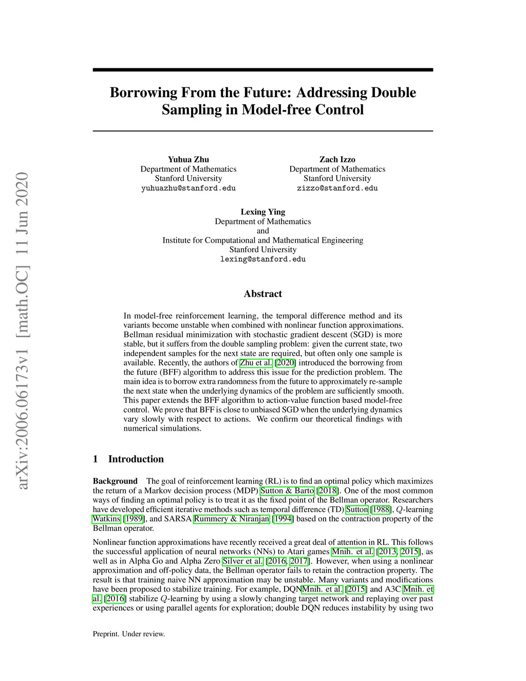 In model-free reinforcement learning, the temporal difference method and its variants become unstable when combined with nonlinear function approximations. Bellman residual minimization with stochastic gradient descent (SGD) is more stable, but it suffers from the double sampling problem: given the current state, two independent samples for the next state are required, but often only one sample is available. Recently, the authors of [Zhu et al, 2020] introduced the borrowing from the future (BFF) algorithm to address this issue for the prediction problem. The main idea is to borrow extra randomness from the future to approximately re-sample the next state when the underlying dynamics of the problem are sufficiently smooth. This paper extends the BFF algorithm to action-value function based model-free control. We prove that BFF is close to unbiased SGD when the underlying dynamics vary slowly with respect to actions. We confirm our theoretical findings with numerical simulations.