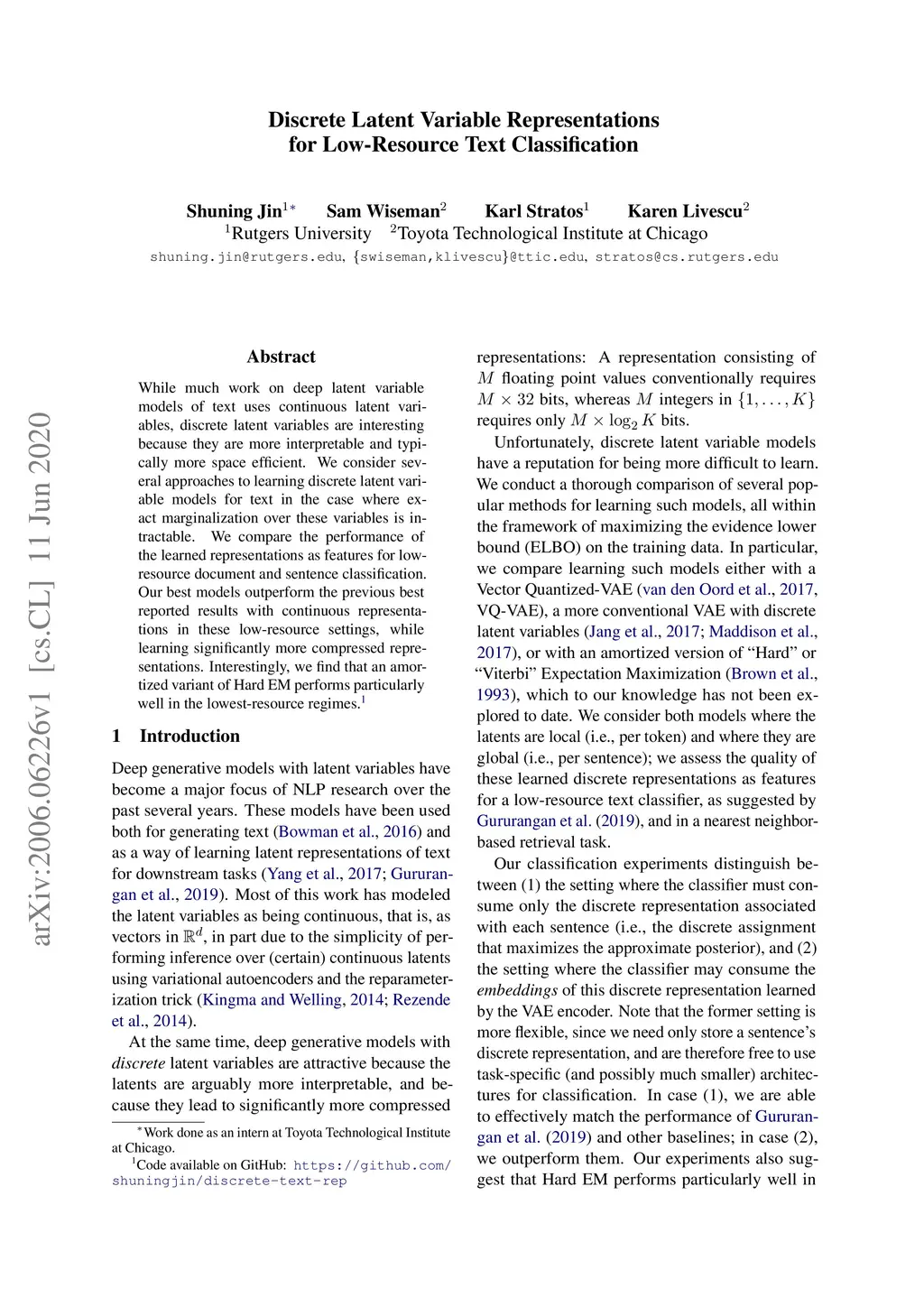 While much work on deep latent variable models of text uses continuous latent variables, discrete latent variables are interesting because they are more interpretable and typically more space efficient. We consider several approaches to learning discrete latent variable models for text in the case where exact marginalization over these variables is intractable. We compare the performance of the learned representations as features for low-resource document and sentence classification. Our best models outperform the previous best reported results with continuous representations in these low-resource settings, while learning significantly more compressed representations. Interestingly, we find that an amortized variant of Hard EM performs particularly well in the lowest-resource regimes.