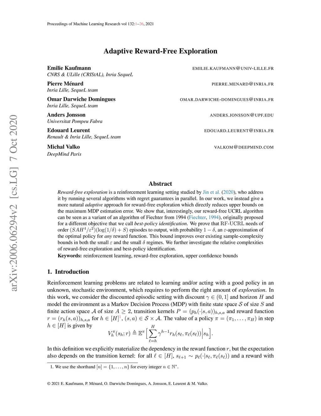 Reward-free exploration is a reinforcement learning setting studied by Jin et al. (2020), who address it by running several algorithms with regret guarantees in parallel. In our work, we instead give a more natural adaptive approach for reward-free exploration which directly reduces upper bounds on the maximum MDP estimation error. We show that, interestingly, our reward-free UCRL algorithm can be seen as a variant of an algorithm of Fiechter from 1994, originally proposed for a different objective that we call best-policy identification. We prove that RF-UCRL needs of order episodes to output, with probability , an -approximation of the optimal policy for any reward function. This bound improves over existing sample-complexity bounds in both the small and the small regimes. We further investigate the relative complexities of reward-free exploration and best-policy identification.