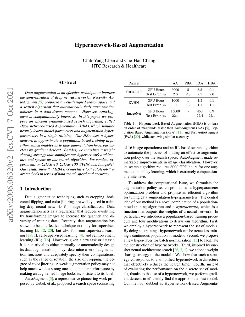 Data augmentation is an effective technique to improve the generalization of deep neural networks. Recently, AutoAugment proposed a well-designed search space and a search algorithm that automatically finds augmentation policies in a data-driven manner. However, AutoAugment is computationally intensive. In this paper, we propose an efficient gradient-based search algorithm, called Hypernetwork-Based Augmentation (HBA), which simultaneously learns model parameters and augmentation hyperparameters in a single training. Our HBA uses a hypernetwork to approximate a population-based training algorithm, which enables us to tune augmentation hyperparameters by gradient descent. Besides, we introduce a weight sharing strategy that simplifies our hypernetwork architecture and speeds up our search algorithm. We conduct experiments on CIFAR-10, CIFAR-100, SVHN, and ImageNet. Our results show that HBA is competitive to the state-of-the-art methods in terms of both search speed and accuracy.