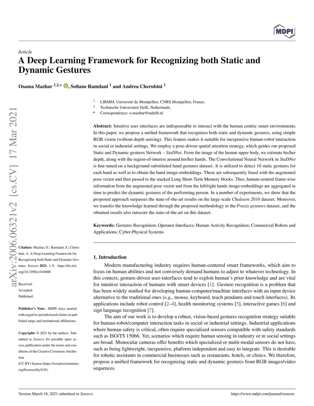 Intuitive user interfaces are indispensable to interact with the human centric smart environments. In this paper, we propose a unified framework that recognizes both static and dynamic gestures, using simple RGB vision (without depth sensing). This feature makes it suitable for inexpensive human-robot interaction in social or industrial settings. We employ a pose-driven spatial attention strategy, which guides our proposed Static and Dynamic gestures Network - StaDNet. From the image of the human upper body, we estimate his/her depth, along with the region-of-interest around his/her hands. The Convolutional Neural Network in StaDNet is fine-tuned on a background-substituted hand gestures dataset. It is utilized to detect 10 static gestures for each hand as well as to obtain the hand image-embeddings. These are subsequently fused with the augmented pose vector and then passed to the stacked Long Short-Term Memory blocks. Thus, human-centred frame-wise information from the augmented pose vector and from the left/right hands image-embeddings are aggregated in time to predict the dynamic gestures of the performing person. In a number of experiments, we show that the proposed approach surpasses the state-of-the-art results on the large-scale Chalearn 2016 dataset. Moreover, we transfer the knowledge learned through the proposed methodology to the Praxis gestures dataset, and the obtained results also outscore the state-of-the-art on this dataset.