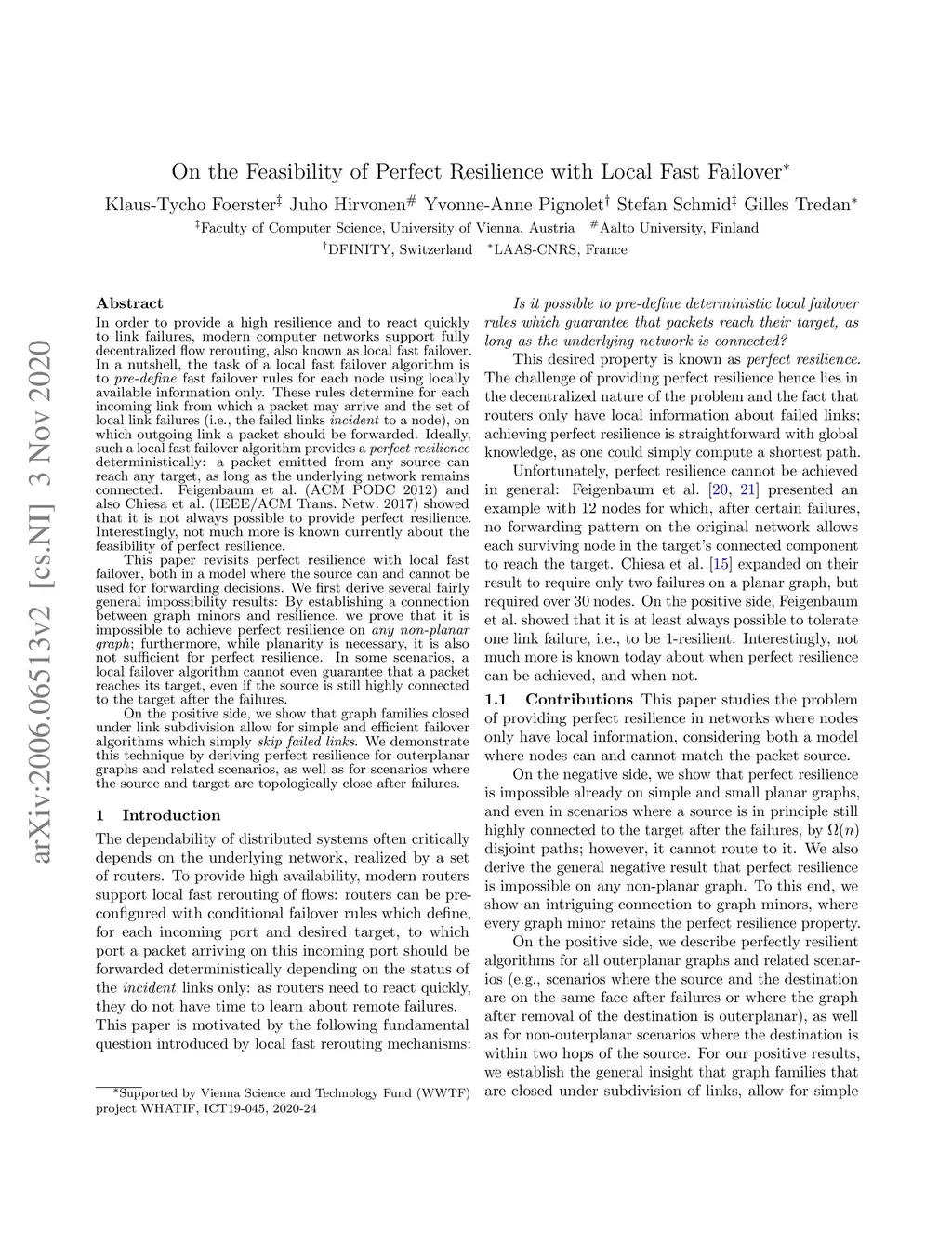 In order to provide a high resilience and to react quickly to link failures, modern computer networks support fully decentralized flow rerouting, also known as local fast failover. In a nutshell, the task of a local fast failover algorithm is to pre-define fast failover rules for each node using locally available information only. These rules determine for each incoming link from which a packet may arrive and the set of local link failures (i.e., the failed links incident to a node), on which outgoing link a packet should be forwarded. Ideally, such a local fast failover algorithm provides a perfect resilience deterministically: a packet emitted from any source can reach any target, as long as the underlying network remains connected. Feigenbaum et al. (ACM PODC 2012) and also Chiesa et al. (IEEE/ACM Trans. Netw. 2017) showed that it is not always possible to provide perfect resilience. Interestingly, not much more is known currently about the feasibility of perfect resilience. This paper revisits perfect resilience with local fast failover, both in a model where the source can and cannot be used for forwarding decisions. We first derive several fairly general impossibility results: By establishing a connection between graph minors and resilience, we prove that it is impossible to achieve perfect resilience on any non-planar graph; furthermore, while planarity is necessary, it is also not sufficient for perfect resilience. On the positive side, we show that graph families closed under link subdivision allow for simple and efficient failover algorithms which simply skip failed links. We demonstrate this technique by deriving perfect resilience for outerplanar graphs and related scenarios, as well as for scenarios where the source and target are topologically close after failures.