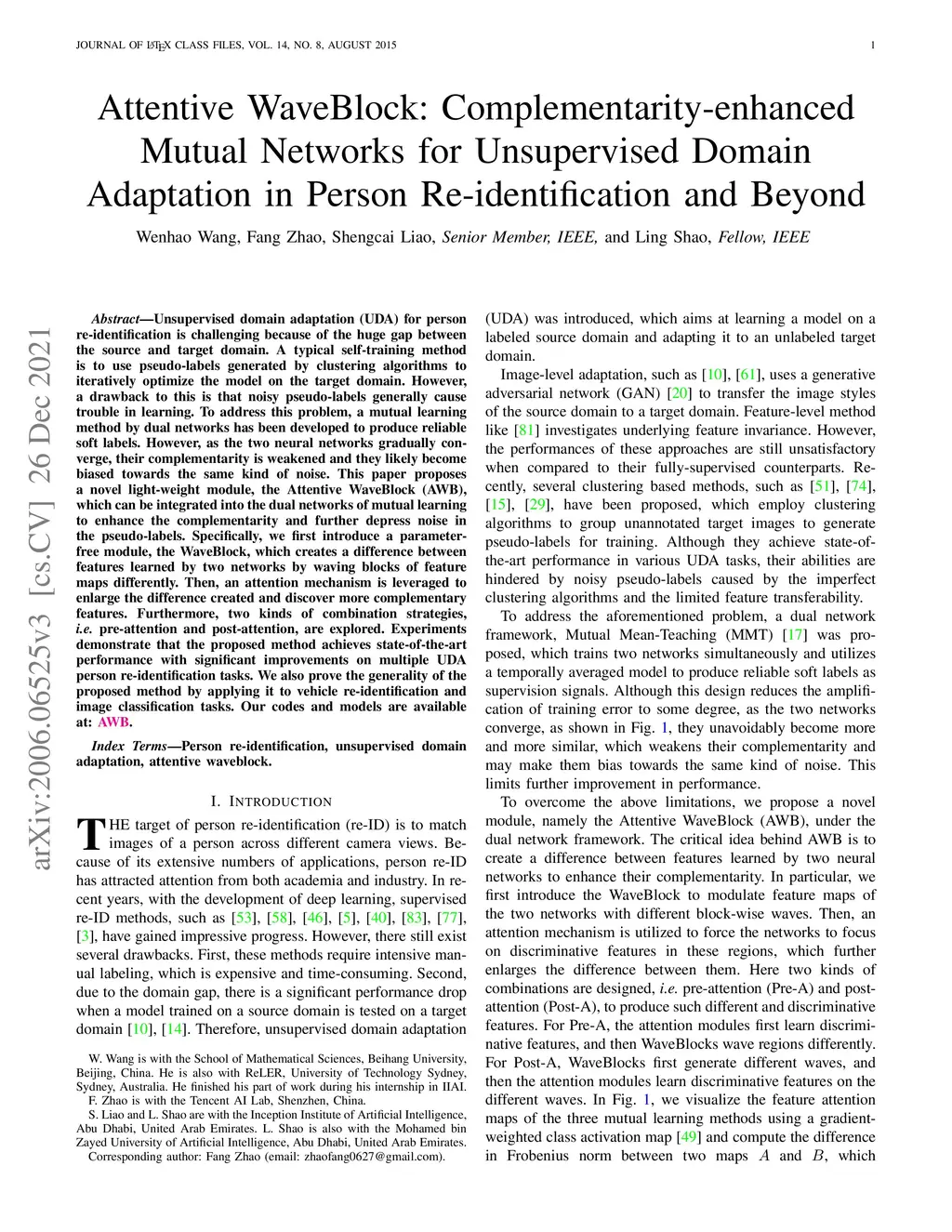 Unsupervised domain adaptation (UDA) for person re-identification is challenging because of the huge gap between the source and target domain. A typical self-training method is to use pseudo-labels generated by clustering algorithms to iteratively optimize the model on the target domain. However, a drawback to this is that noisy pseudo-labels generally cause trouble in learning. To address this problem, a mutual learning method by dual networks has been developed to produce reliable soft labels. However, as the two neural networks gradually converge, their complementarity is weakened and they likely become biased towards the same kind of noise. This paper proposes a novel light-weight module, the Attentive WaveBlock (AWB), which can be integrated into the dual networks of mutual learning to enhance the complementarity and further depress noise in the pseudo-labels. Specifically, we first introduce a parameter-free module, the WaveBlock, which creates a difference between features learned by two networks by waving blocks of feature maps differently. Then, an attention mechanism is leveraged to enlarge the difference created and discover more complementary features. Furthermore, two kinds of combination strategies, i.e. pre-attention and post-attention, are explored. Experiments demonstrate that the proposed method achieves state-of-the-art performance with significant improvements on multiple UDA person re-identification tasks. We also prove the generality of the proposed method by applying it to vehicle re-identification and image classification tasks. Our codes and models are available at https://github.com/WangWenhao0716/Attentive-WaveBlock.