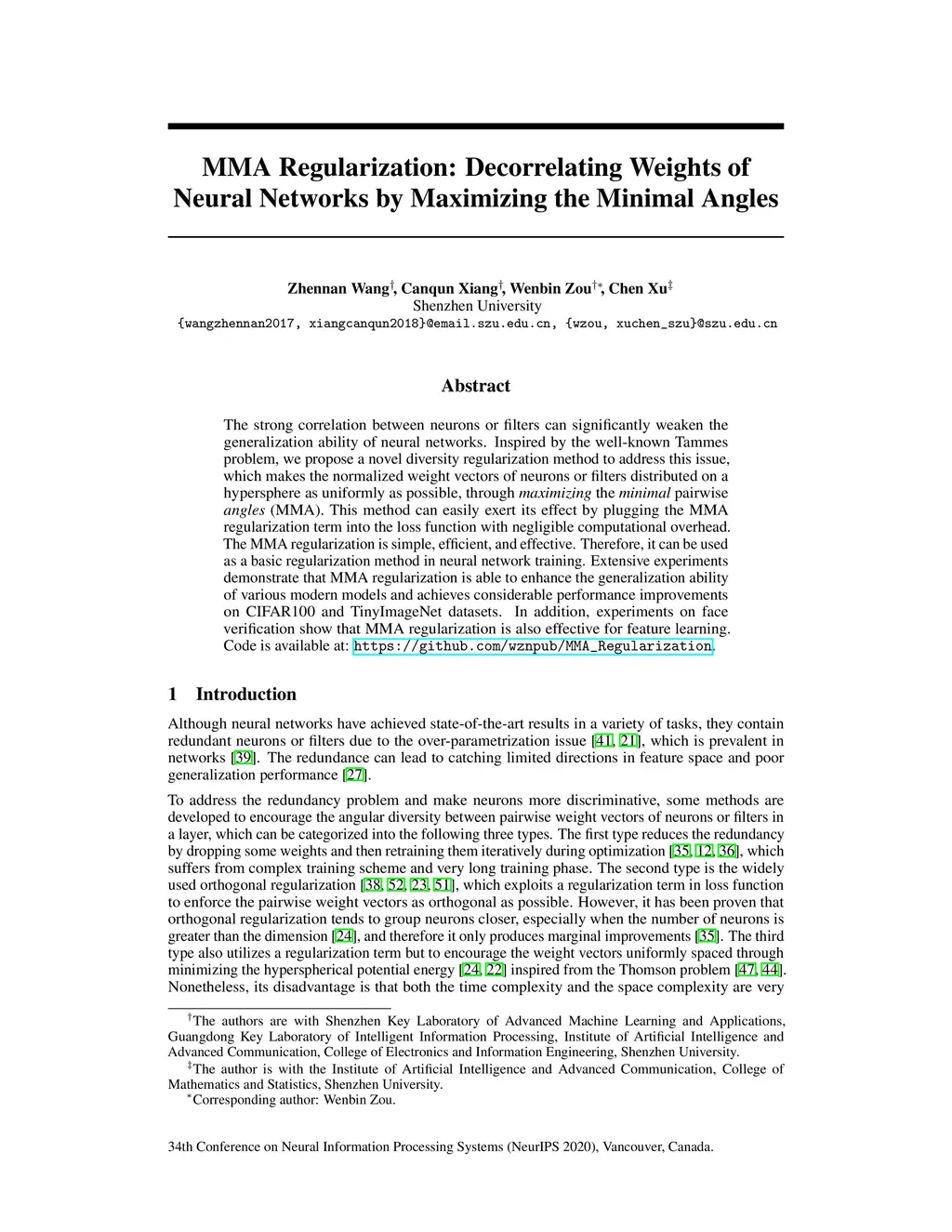 The strong correlation between neurons or filters can significantly weaken the generalization ability of neural networks. Inspired by the well-known Tammes problem, we propose a novel diversity regularization method to address this issue, which makes the normalized weight vectors of neurons or filters distributed on a hypersphere as uniformly as possible, through maximizing the minimal pairwise angles (MMA). This method can easily exert its effect by plugging the MMA regularization term into the loss function with negligible computational overhead. The MMA regularization is simple, efficient, and effective. Therefore, it can be used as a basic regularization method in neural network training. Extensive experiments demonstrate that MMA regularization is able to enhance the generalization ability of various modern models and achieves considerable performance improvements on CIFAR100 and TinyImageNet datasets. In addition, experiments on face verification show that MMA regularization is also effective for feature learning. Code is available at: https://github.com/wznpub/MMA_Regularization.