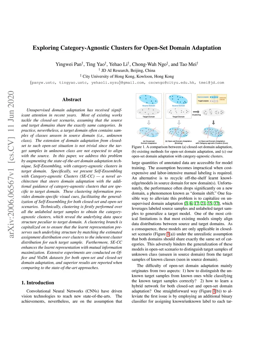 Unsupervised domain adaptation has received significant attention in recent years. Most of existing works tackle the closed-set scenario, assuming that the source and target domains share the exactly same categories. In practice, nevertheless, a target domain often contains samples of classes unseen in source domain (i.e., unknown class). The extension of domain adaptation from closed-set to such open-set situation is not trivial since the target samples in unknown class are not expected to align with the source. In this paper, we address this problem by augmenting the state-of-the-art domain adaptation technique, Self-Ensembling, with category-agnostic clusters in target domain. Specifically, we present Self-Ensembling with Category-agnostic Clusters (SE-CC) -- a novel architecture that steers domain adaptation with the additional guidance of category-agnostic clusters that are specific to target domain. These clustering information provides domain-specific visual cues, facilitating the generalization of Self-Ensembling for both closed-set and open-set scenarios. Technically, clustering is firstly performed over all the unlabeled target samples to obtain the category-agnostic clusters, which reveal the underlying data space structure peculiar to target domain. A clustering branch is capitalized on to ensure that the learnt representation preserves such underlying structure by matching the estimated assignment distribution over clusters to the inherent cluster distribution for each target sample. Furthermore, SE-CC enhances the learnt representation with mutual information maximization. Extensive experiments are conducted on Office and VisDA datasets for both open-set and closed-set domain adaptation, and superior results are reported when comparing to the state-of-the-art approaches.