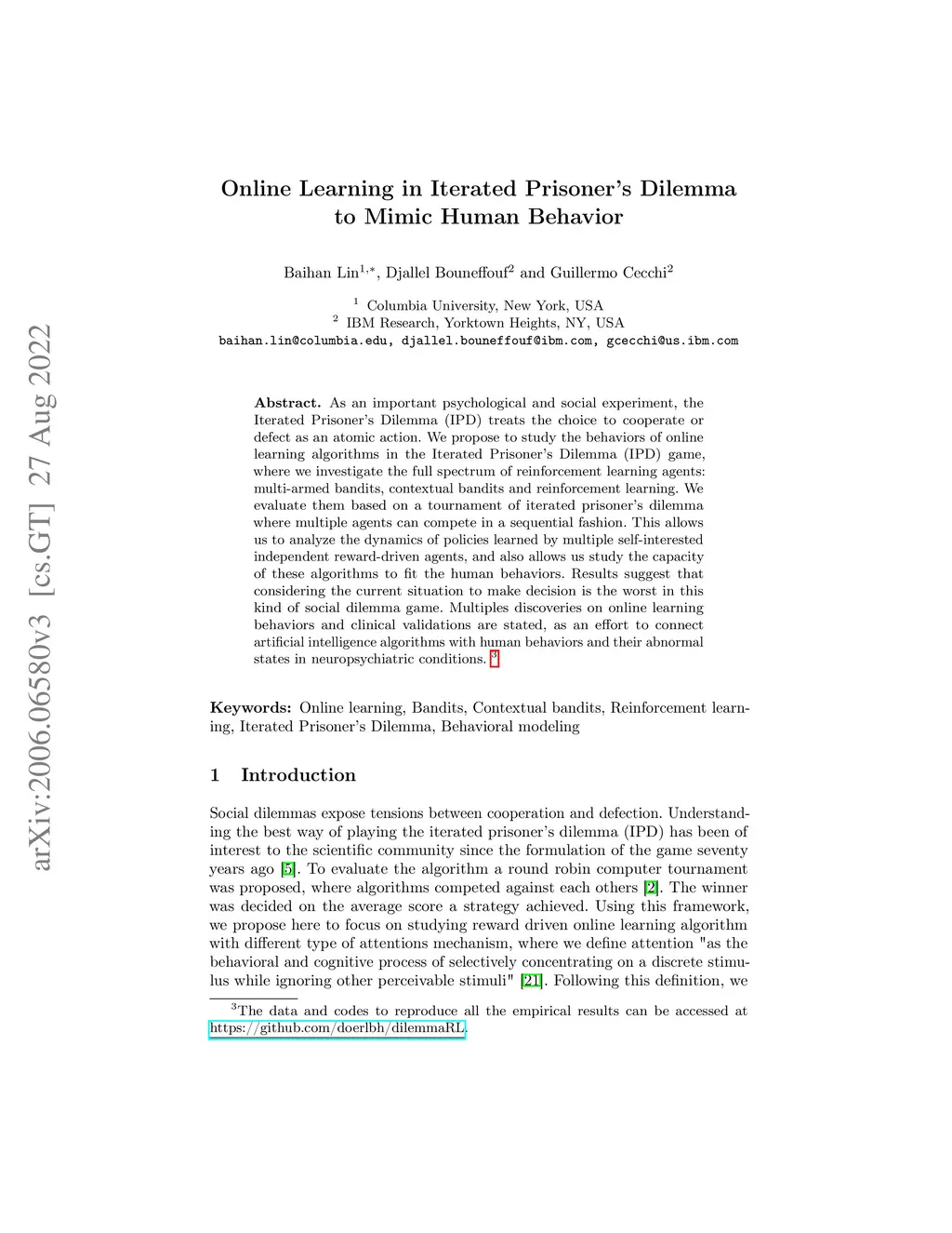 As an important psychological and social experiment, the Iterated Prisoner's Dilemma (IPD) treats the choice to cooperate or defect as an atomic action. We propose to study the behaviors of online learning algorithms in the Iterated Prisoner's Dilemma (IPD) game, where we investigate the full spectrum of reinforcement learning agents: multi-armed bandits, contextual bandits and reinforcement learning. We evaluate them based on a tournament of iterated prisoner's dilemma where multiple agents can compete in a sequential fashion. This allows us to analyze the dynamics of policies learned by multiple self-interested independent reward-driven agents, and also allows us study the capacity of these algorithms to fit the human behaviors. Results suggest that considering the current situation to make decision is the worst in this kind of social dilemma game. Multiples discoveries on online learning behaviors and clinical validations are stated, as an effort to connect artificial intelligence algorithms with human behaviors and their abnormal states in neuropsychiatric conditions.