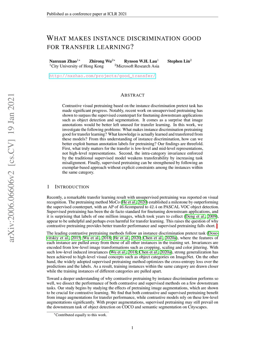 Contrastive visual pretraining based on the instance discrimination pretext task has made significant progress. Notably, recent work on unsupervised pretraining has shown to surpass the supervised counterpart for finetuning downstream applications such as object detection and segmentation. It comes as a surprise that image annotations would be better left unused for transfer learning. In this work, we investigate the following problems: What makes instance discrimination pretraining good for transfer learning? What knowledge is actually learned and transferred from these models? From this understanding of instance discrimination, how can we better exploit human annotation labels for pretraining? Our findings are threefold. First, what truly matters for the transfer is low-level and mid-level representations, not high-level representations. Second, the intra-category invariance enforced by the traditional supervised model weakens transferability by increasing task misalignment. Finally, supervised pretraining can be strengthened by following an exemplar-based approach without explicit constraints among the instances within the same category.