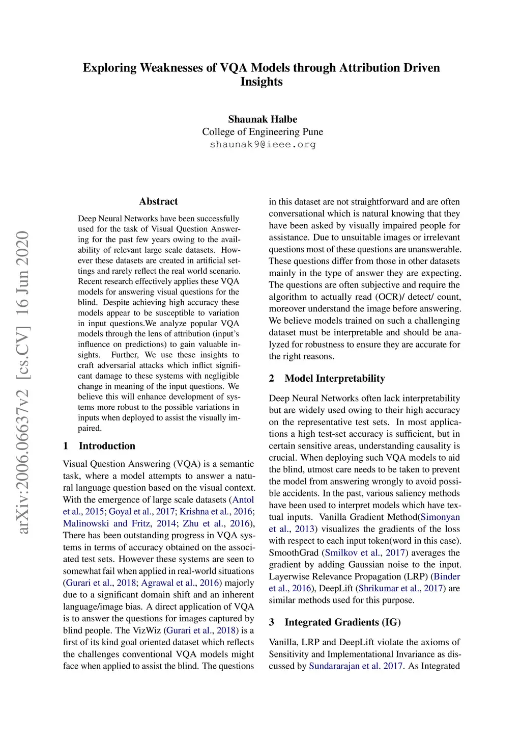 Deep Neural Networks have been successfully used for the task of Visual Question Answering for the past few years owing to the availability of relevant large scale datasets. However these datasets are created in artificial settings and rarely reflect the real world scenario. Recent research effectively applies these VQA models for answering visual questions for the blind. Despite achieving high accuracy these models appear to be susceptible to variation in input questions.We analyze popular VQA models through the lens of attribution (input's influence on predictions) to gain valuable insights. Further, We use these insights to craft adversarial attacks which inflict significant damage to these systems with negligible change in meaning of the input questions. We believe this will enhance development of systems more robust to the possible variations in inputs when deployed to assist the visually impaired.