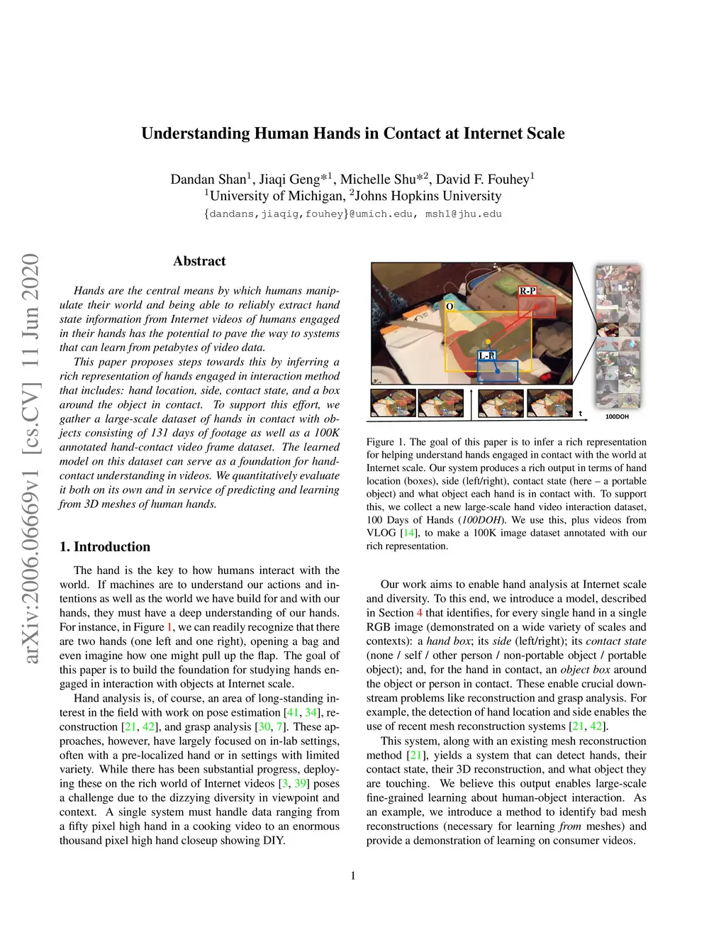 Hands are the central means by which humans manipulate their world and being able to reliably extract hand state information from Internet videos of humans engaged in their hands has the potential to pave the way to systems that can learn from petabytes of video data. This paper proposes steps towards this by inferring a rich representation of hands engaged in interaction method that includes: hand location, side, contact state, and a box around the object in contact. To support this effort, we gather a large-scale dataset of hands in contact with objects consisting of 131 days of footage as well as a 100K annotated hand-contact video frame dataset. The learned model on this dataset can serve as a foundation for hand-contact understanding in videos. We quantitatively evaluate it both on its own and in service of predicting and learning from 3D meshes of human hands.