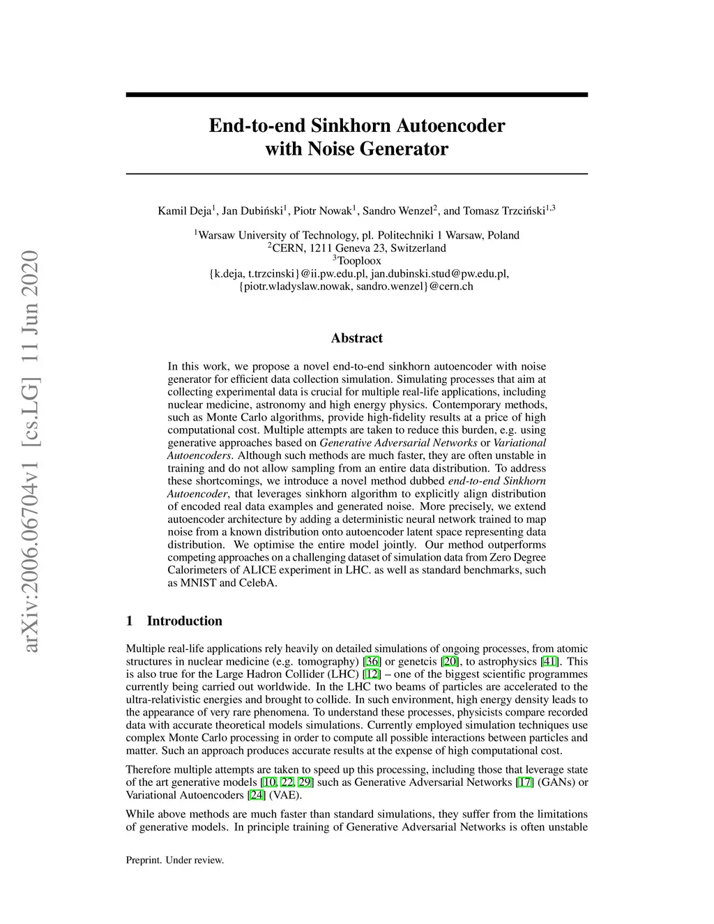 In this work, we propose a novel end-to-end sinkhorn autoencoder with noise generator for efficient data collection simulation. Simulating processes that aim at collecting experimental data is crucial for multiple real-life applications, including nuclear medicine, astronomy and high energy physics. Contemporary methods, such as Monte Carlo algorithms, provide high-fidelity results at a price of high computational cost. Multiple attempts are taken to reduce this burden, e.g. using generative approaches based on Generative Adversarial Networks or Variational Autoencoders. Although such methods are much faster, they are often unstable in training and do not allow sampling from an entire data distribution. To address these shortcomings, we introduce a novel method dubbed end-to-end Sinkhorn Autoencoder, that leverages sinkhorn algorithm to explicitly align distribution of encoded real data examples and generated noise. More precisely, we extend autoencoder architecture by adding a deterministic neural network trained to map noise from a known distribution onto autoencoder latent space representing data distribution. We optimise the entire model jointly. Our method outperforms competing approaches on a challenging dataset of simulation data from Zero Degree Calorimeters of ALICE experiment in LHC. as well as standard benchmarks, such as MNIST and CelebA.
