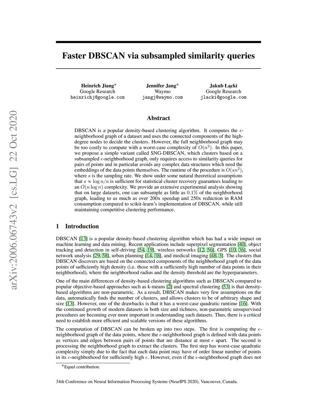 DBSCAN is a popular density-based clustering algorithm. It computes the -neighborhood graph of a dataset and uses the connected components of the high-degree nodes to decide the clusters. However, the full neighborhood graph may be too costly to compute with a worst-case complexity of . In this paper, we propose a simple variant called SNG-DBSCAN, which clusters based on a subsampled -neighborhood graph, only requires access to similarity queries for pairs of points and in particular avoids any complex data structures which need the embeddings of the data points themselves. The runtime of the procedure is , where is the sampling rate. We show under some natural theoretical assumptions that is sufficient for statistical cluster recovery guarantees leading to an complexity. We provide an extensive experimental analysis showing that on large datasets, one can subsample as little as of the neighborhood graph, leading to as much as over 200x speedup and 250x reduction in RAM consumption compared to scikit-learn's implementation of DBSCAN, while still maintaining competitive clustering performance.
