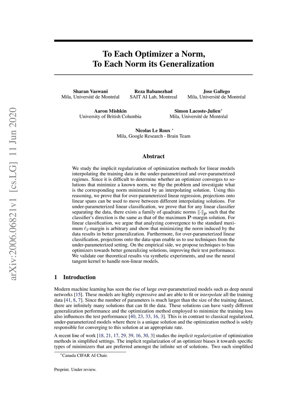 We study the implicit regularization of optimization methods for linear models interpolating the training data in the under-parametrized and over-parametrized regimes. Since it is difficult to determine whether an optimizer converges to solutions that minimize a known norm, we flip the problem and investigate what is the corresponding norm minimized by an interpolating solution. Using this reasoning, we prove that for over-parameterized linear regression, projections onto linear spans can be used to move between different interpolating solutions. For under-parameterized linear classification, we prove that for any linear classifier separating the data, there exists a family of quadratic norms ||.||_P such that the classifier's direction is the same as that of the maximum P-margin solution. For linear classification, we argue that analyzing convergence to the standard maximum l2-margin is arbitrary and show that minimizing the norm induced by the data results in better generalization. Furthermore, for over-parameterized linear classification, projections onto the data-span enable us to use techniques from the under-parameterized setting. On the empirical side, we propose techniques to bias optimizers towards better generalizing solutions, improving their test performance. We validate our theoretical results via synthetic experiments, and use the neural tangent kernel to handle non-linear models.