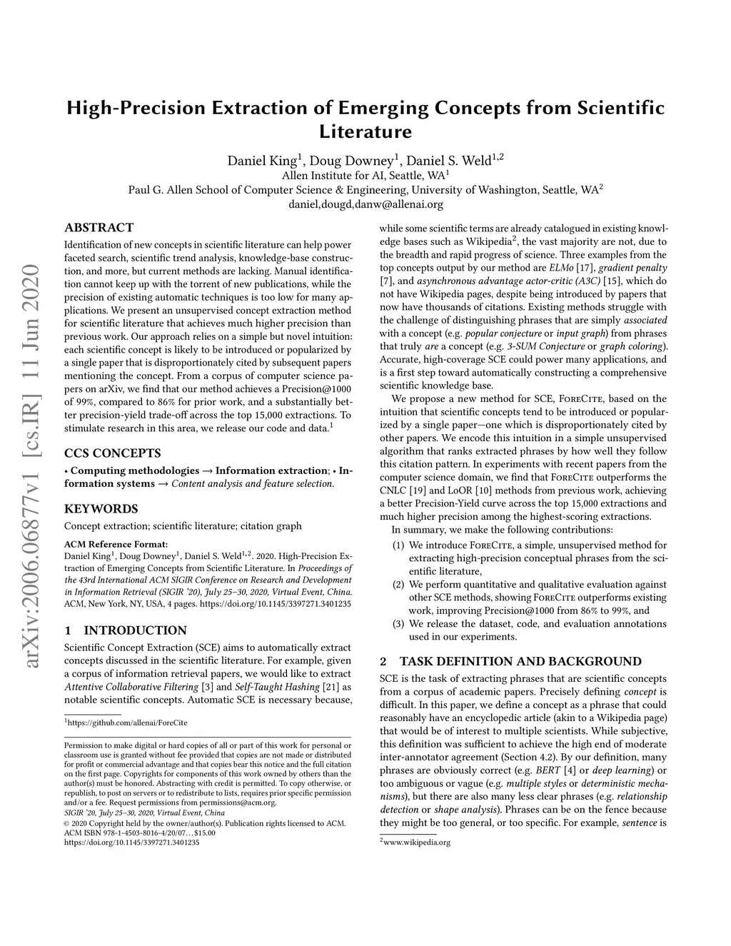 Identification of new concepts in scientific literature can help power faceted search, scientific trend analysis, knowledge-base construction, and more, but current methods are lacking. Manual identification cannot keep up with the torrent of new publications, while the precision of existing automatic techniques is too low for many applications. We present an unsupervised concept extraction method for scientific literature that achieves much higher precision than previous work. Our approach relies on a simple but novel intuition: each scientific concept is likely to be introduced or popularized by a single paper that is disproportionately cited by subsequent papers mentioning the concept. From a corpus of computer science papers on arXiv, we find that our method achieves a Precision@1000 of 99%, compared to 86% for prior work, and a substantially better precision-yield trade-off across the top 15,000 extractions. To stimulate research in this area, we release our code and data (https://github.com/allenai/ForeCite).