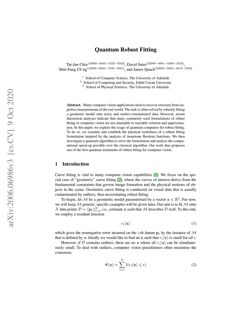 Many computer vision applications need to recover structure from imperfect measurements of the real world. The task is often solved by robustly fitting a geometric model onto noisy and outlier-contaminated data. However, recent theoretical analyses indicate that many commonly used formulations of robust fitting in computer vision are not amenable to tractable solution and approximation. In this paper, we explore the usage of quantum computers for robust fitting. To do so, we examine and establish the practical usefulness of a robust fitting formulation inspired by Fourier analysis of Boolean functions. We then investigate a quantum algorithm to solve the formulation and analyse the computational speed-up possible over the classical algorithm. Our work thus proposes one of the first quantum treatments of robust fitting for computer vision.