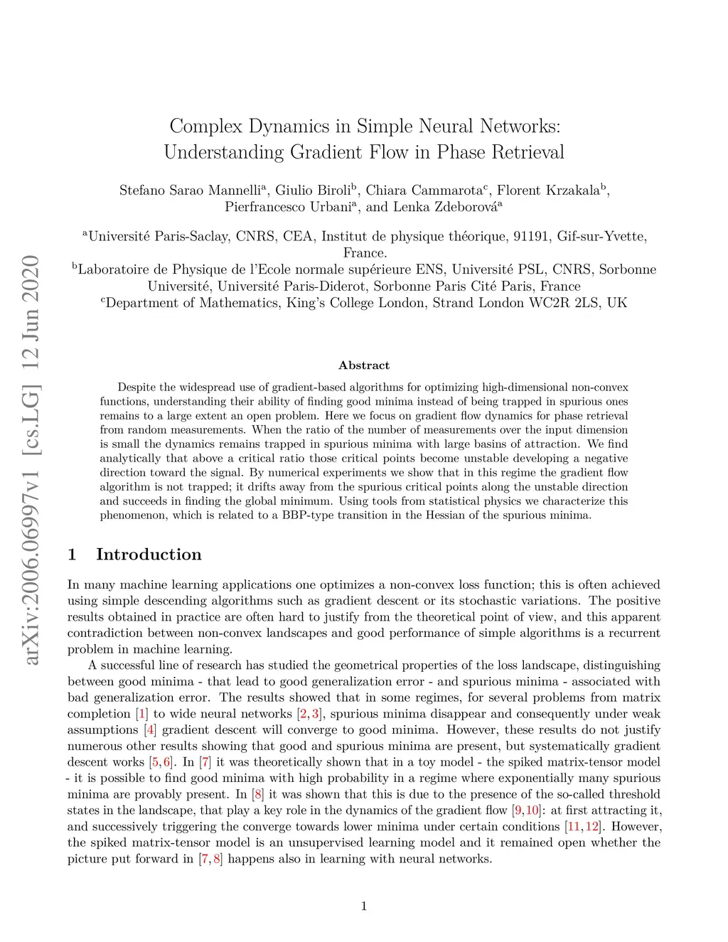 Despite the widespread use of gradient-based algorithms for optimizing high-dimensional non-convex functions, understanding their ability of finding good minima instead of being trapped in spurious ones remains to a large extent an open problem. Here we focus on gradient flow dynamics for phase retrieval from random measurements. When the ratio of the number of measurements over the input dimension is small the dynamics remains trapped in spurious minima with large basins of attraction. We find analytically that above a critical ratio those critical points become unstable developing a negative direction toward the signal. By numerical experiments we show that in this regime the gradient flow algorithm is not trapped; it drifts away from the spurious critical points along the unstable direction and succeeds in finding the global minimum. Using tools from statistical physics we characterize this phenomenon, which is related to a BBP-type transition in the Hessian of the spurious minima.