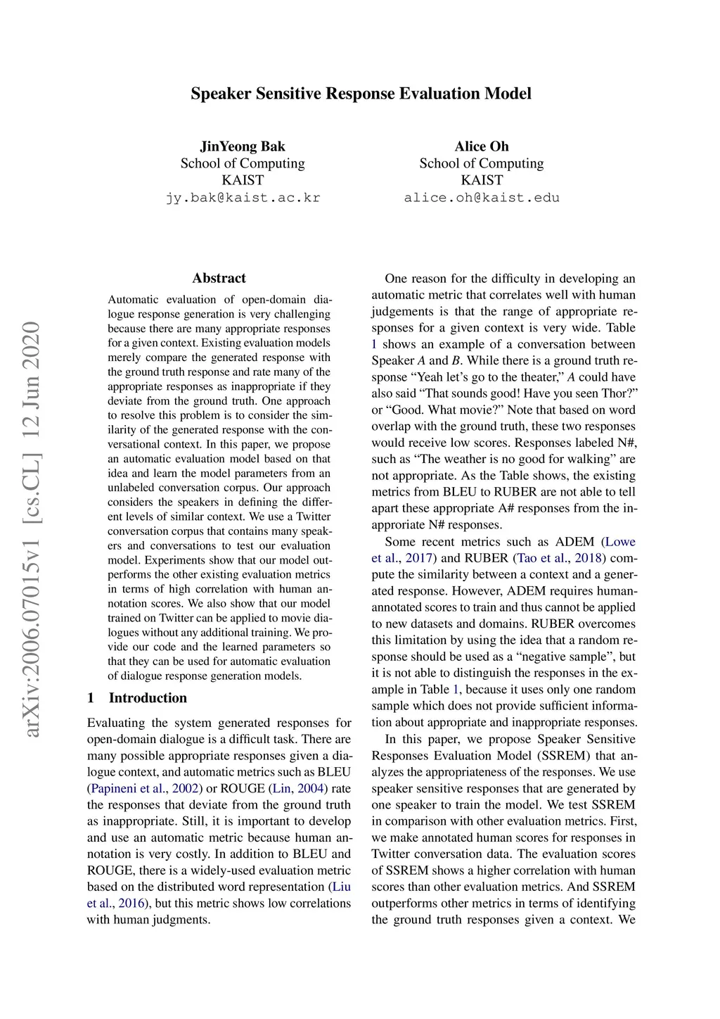 Speaker Sensitive Response Evaluation Model