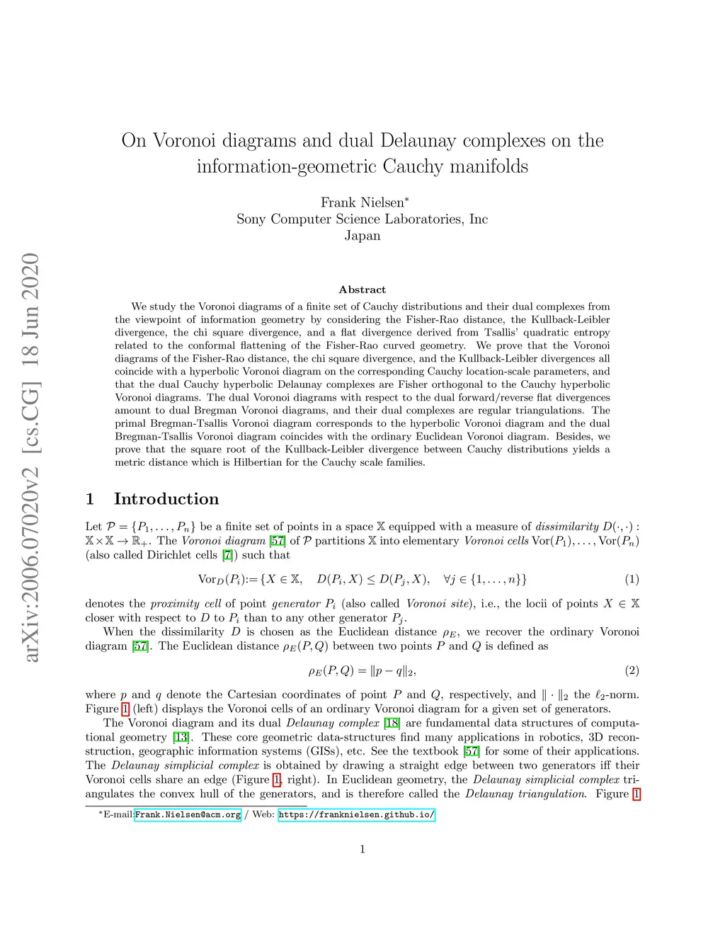 We study the Voronoi diagrams of a finite set of Cauchy distributions and their dual complexes from the viewpoint of information geometry by considering the Fisher-Rao distance, the Kullback-Leibler divergence, the chi square divergence, and a flat divergence derived from Tsallis' quadratic entropy related to the conformal flattening of the Fisher-Rao curved geometry. We prove that the Voronoi diagrams of the Fisher-Rao distance, the chi square divergence, and the Kullback-Leibler divergences all coincide with a hyperbolic Voronoi diagram on the corresponding Cauchy location-scale parameters, and that the dual Cauchy hyperbolic Delaunay complexes are Fisher orthogonal to the Cauchy hyperbolic Voronoi diagrams. The dual Voronoi diagrams with respect to the dual forward/reverse flat divergences amount to dual Bregman Voronoi diagrams, and their dual complexes are regular triangulations. The primal Bregman-Tsallis Voronoi diagram corresponds to the hyperbolic Voronoi diagram and the dual Bregman-Tsallis Voronoi diagram coincides with the ordinary Euclidean Voronoi diagram. Besides, we prove that the square root of the Kullback-Leibler divergence between Cauchy distributions yields a metric distance which is Hilbertian for the Cauchy scale families.