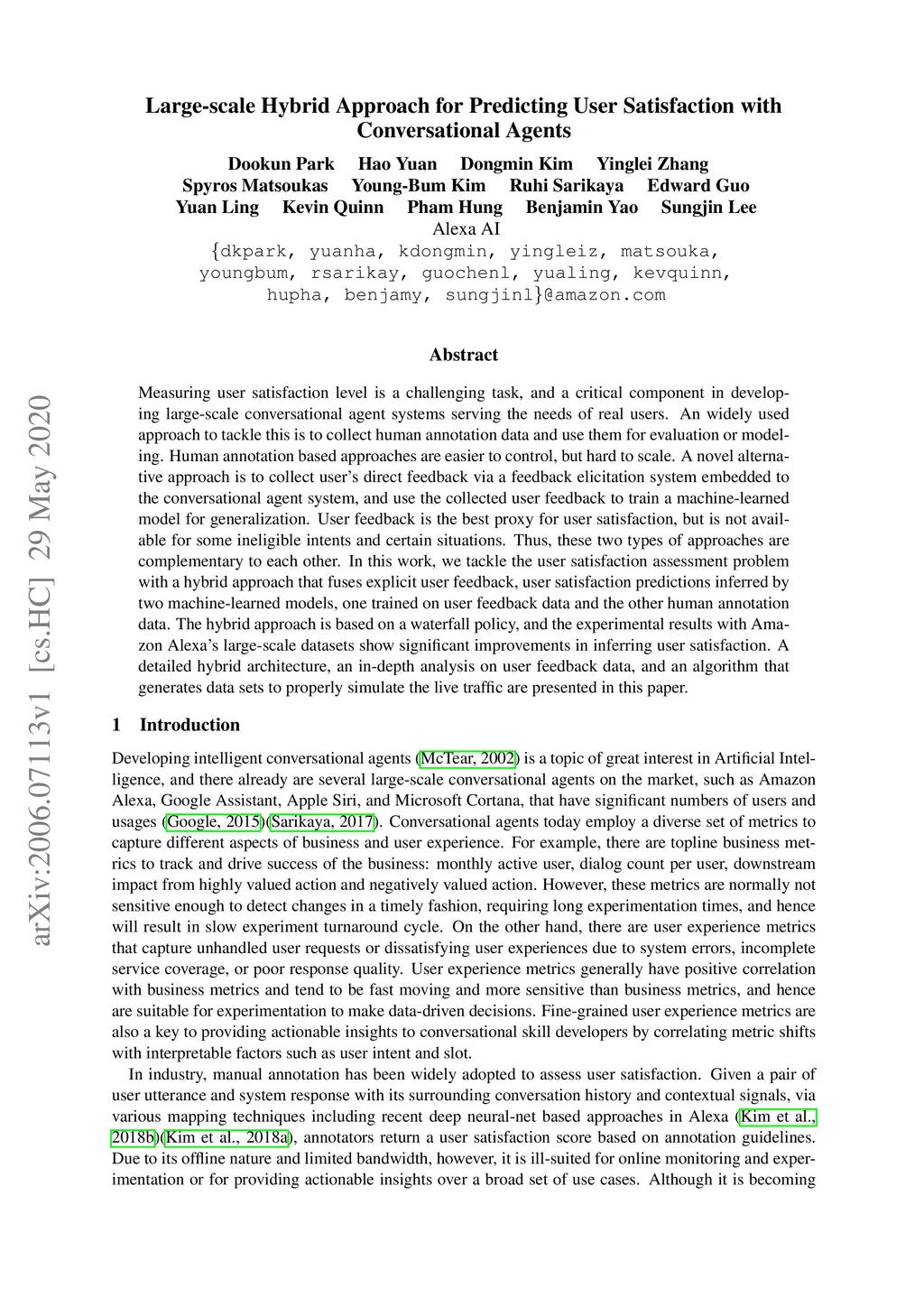 Measuring user satisfaction level is a challenging task, and a critical component in developing large-scale conversational agent systems serving the needs of real users. An widely used approach to tackle this is to collect human annotation data and use them for evaluation or modeling. Human annotation based approaches are easier to control, but hard to scale. A novel alternative approach is to collect user's direct feedback via a feedback elicitation system embedded to the conversational agent system, and use the collected user feedback to train a machine-learned model for generalization. User feedback is the best proxy for user satisfaction, but is not available for some ineligible intents and certain situations. Thus, these two types of approaches are complementary to each other. In this work, we tackle the user satisfaction assessment problem with a hybrid approach that fuses explicit user feedback, user satisfaction predictions inferred by two machine-learned models, one trained on user feedback data and the other human annotation data. The hybrid approach is based on a waterfall policy, and the experimental results with Amazon Alexa's large-scale datasets show significant improvements in inferring user satisfaction. A detailed hybrid architecture, an in-depth analysis on user feedback data, and an algorithm that generates data sets to properly simulate the live traffic are presented in this paper.