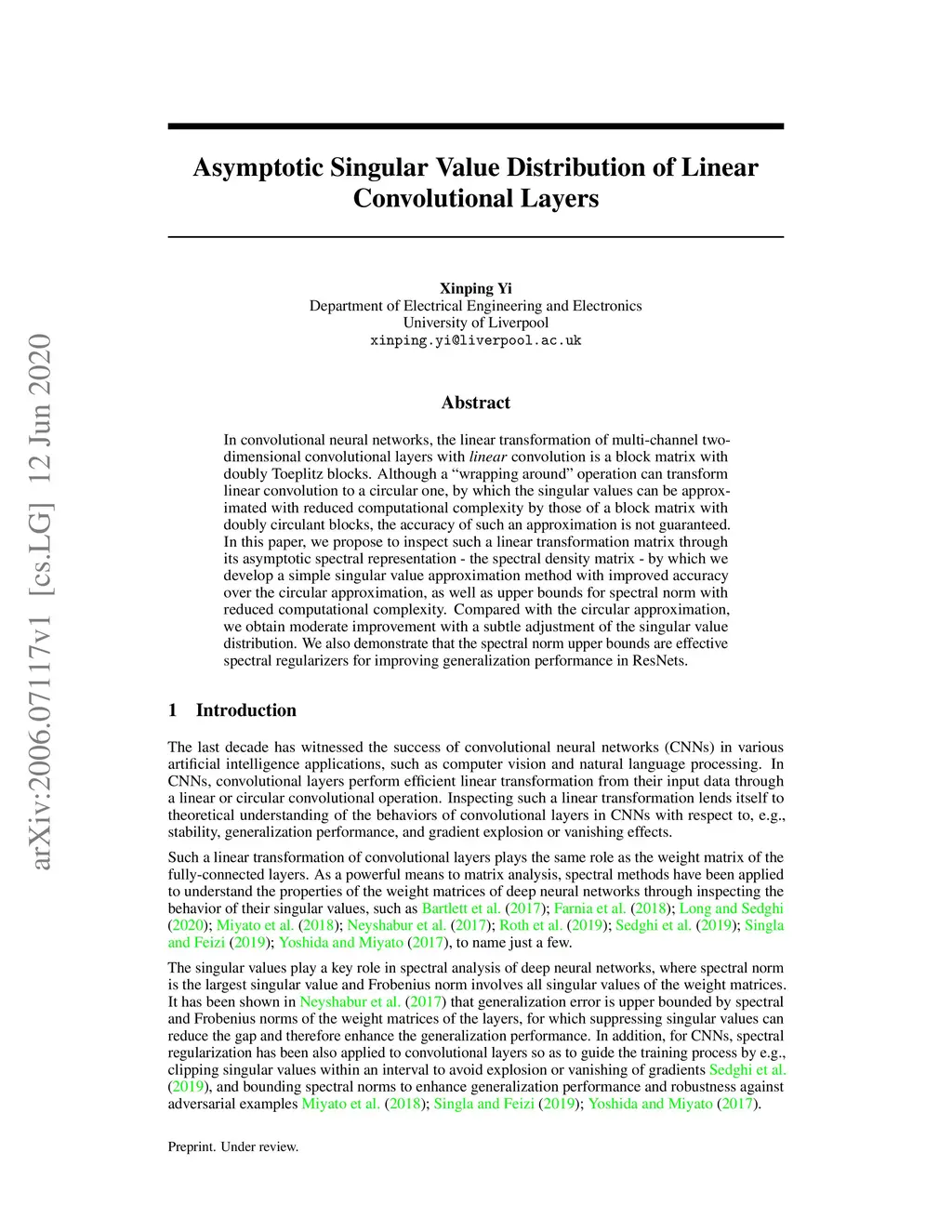 In convolutional neural networks, the linear transformation of multi-channel two-dimensional convolutional layers with linear convolution is a block matrix with doubly Toeplitz blocks. Although a "wrapping around" operation can transform linear convolution to a circular one, by which the singular values can be approximated with reduced computational complexity by those of a block matrix with doubly circulant blocks, the accuracy of such an approximation is not guaranteed. In this paper, we propose to inspect such a linear transformation matrix through its asymptotic spectral representation - the spectral density matrix - by which we develop a simple singular value approximation method with improved accuracy over the circular approximation, as well as upper bounds for spectral norm with reduced computational complexity. Compared with the circular approximation, we obtain moderate improvement with a subtle adjustment of the singular value distribution. We also demonstrate that the spectral norm upper bounds are effective spectral regularizers for improving generalization performance in ResNets.