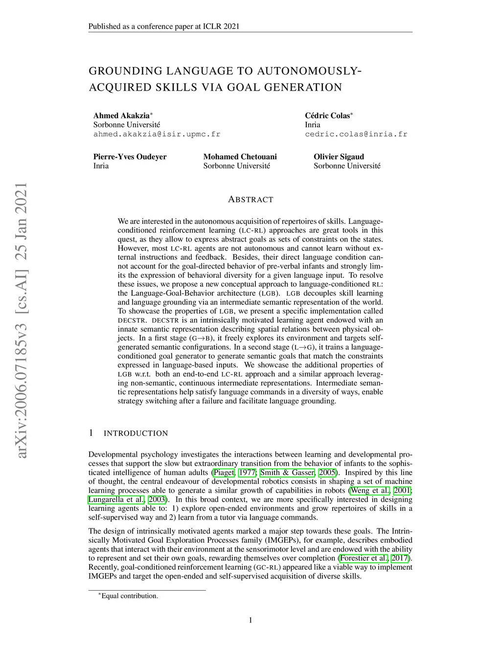 We are interested in the autonomous acquisition of repertoires of skills. Language-conditioned reinforcement learning (LC-RL) approaches are great tools in this quest, as they allow to express abstract goals as sets of constraints on the states. However, most LC-RL agents are not autonomous and cannot learn without external instructions and feedback. Besides, their direct language condition cannot account for the goal-directed behavior of pre-verbal infants and strongly limits the expression of behavioral diversity for a given language input. To resolve these issues, we propose a new conceptual approach to language-conditioned RL: the Language-Goal-Behavior architecture (LGB). LGB decouples skill learning and language grounding via an intermediate semantic representation of the world. To showcase the properties of LGB, we present a specific implementation called DECSTR. DECSTR is an intrinsically motivated learning agent endowed with an innate semantic representation describing spatial relations between physical objects. In a first stage (G -> B), it freely explores its environment and targets self-generated semantic configurations. In a second stage (L -> G), it trains a language-conditioned goal generator to generate semantic goals that match the constraints expressed in language-based inputs. We showcase the additional properties of LGB w.r.t. both an end-to-end LC-RL approach and a similar approach leveraging non-semantic, continuous intermediate representations. Intermediate semantic representations help satisfy language commands in a diversity of ways, enable strategy switching after a failure and facilitate language grounding.