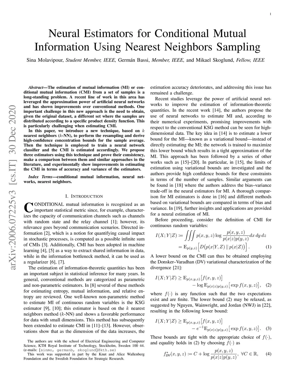 The estimation of mutual information (MI) or conditional mutual information (CMI) from a set of samples is a long-standing problem. A recent line of work in this area has leveraged the approximation power of artificial neural networks and has shown improvements over conventional methods. One important challenge in this new approach is the need to obtain, given the original dataset, a different set where the samples are distributed according to a specific product density function. This is particularly challenging when estimating CMI. In this paper, we introduce a new technique, based on k nearest neighbors (k-NN), to perform the resampling and derive high-confidence concentration bounds for the sample average. Then the technique is employed to train a neural network classifier and the CMI is estimated accordingly. We propose three estimators using this technique and prove their consistency, make a comparison between them and similar approaches in the literature, and experimentally show improvements in estimating the CMI in terms of accuracy and variance of the estimators.