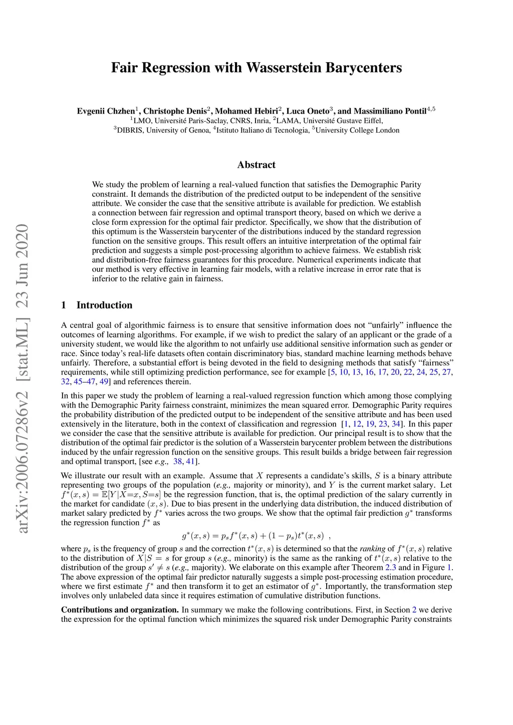 We study the problem of learning a real-valued function that satisfies the Demographic Parity constraint. It demands the distribution of the predicted output to be independent of the sensitive attribute. We consider the case that the sensitive attribute is available for prediction. We establish a connection between fair regression and optimal transport theory, based on which we derive a close form expression for the optimal fair predictor. Specifically, we show that the distribution of this optimum is the Wasserstein barycenter of the distributions induced by the standard regression function on the sensitive groups. This result offers an intuitive interpretation of the optimal fair prediction and suggests a simple post-processing algorithm to achieve fairness. We establish risk and distribution-free fairness guarantees for this procedure. Numerical experiments indicate that our method is very effective in learning fair models, with a relative increase in error rate that is inferior to the relative gain in fairness.