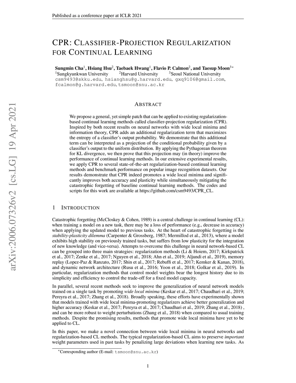 We propose a general, yet simple patch that can be applied to existing regularization-based continual learning methods called classifier-projection regularization (CPR). Inspired by both recent results on neural networks with wide local minima and information theory, CPR adds an additional regularization term that maximizes the entropy of a classifier's output probability. We demonstrate that this additional term can be interpreted as a projection of the conditional probability given by a classifier's output to the uniform distribution. By applying the Pythagorean theorem for KL divergence, we then prove that this projection may (in theory) improve the performance of continual learning methods. In our extensive experimental results, we apply CPR to several state-of-the-art regularization-based continual learning methods and benchmark performance on popular image recognition datasets. Our results demonstrate that CPR indeed promotes a wide local minima and significantly improves both accuracy and plasticity while simultaneously mitigating the catastrophic forgetting of baseline continual learning methods. The codes and scripts for this work are available at https://github.com/csm9493/CPR_CL.