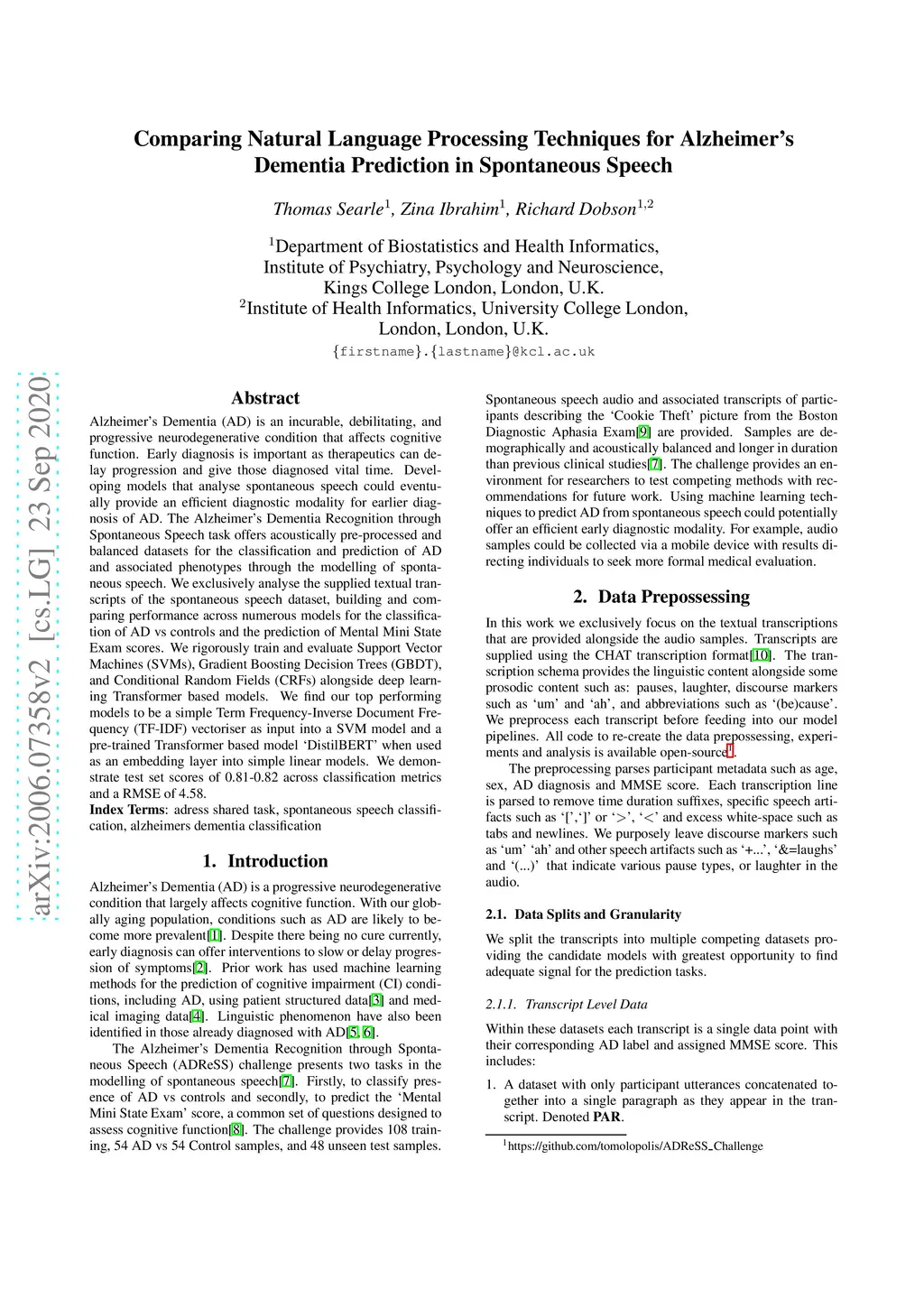Alzheimer's Dementia (AD) is an incurable, debilitating, and progressive neurodegenerative condition that affects cognitive function. Early diagnosis is important as therapeutics can delay progression and give those diagnosed vital time. Developing models that analyse spontaneous speech could eventually provide an efficient diagnostic modality for earlier diagnosis of AD. The Alzheimer's Dementia Recognition through Spontaneous Speech task offers acoustically pre-processed and balanced datasets for the classification and prediction of AD and associated phenotypes through the modelling of spontaneous speech. We exclusively analyse the supplied textual transcripts of the spontaneous speech dataset, building and comparing performance across numerous models for the classification of AD vs controls and the prediction of Mental Mini State Exam scores. We rigorously train and evaluate Support Vector Machines (SVMs), Gradient Boosting Decision Trees (GBDT), and Conditional Random Fields (CRFs) alongside deep learning Transformer based models. We find our top performing models to be a simple Term Frequency-Inverse Document Frequency (TF-IDF) vectoriser as input into a SVM model and a pre-trained Transformer based model `DistilBERT' when used as an embedding layer into simple linear models. We demonstrate test set scores of 0.81-0.82 across classification metrics and a RMSE of 4.58.