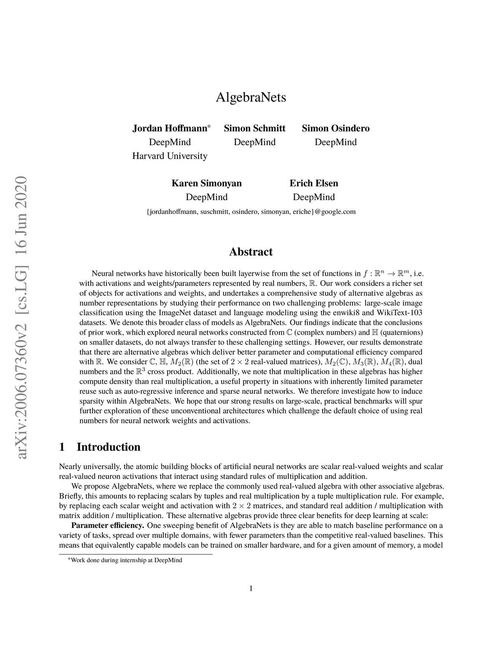 Neural networks have historically been built layerwise from the set of functions in , i.e. with activations and weights/parameters represented by real numbers, . Our work considers a richer set of objects for activations and weights, and undertakes a comprehensive study of alternative algebras as number representations by studying their performance on two challenging problems: large-scale image classification using the ImageNet dataset and language modeling using the enwiki8 and WikiText-103 datasets. We denote this broader class of models as AlgebraNets. Our findings indicate that the conclusions of prior work, which explored neural networks constructed from (complex numbers) and (quaternions) on smaller datasets, do not always transfer to these challenging settings. However, our results demonstrate that there are alternative algebras which deliver better parameter and computational efficiency compared with . We consider , , (the set of real-valued matrices), , and . Additionally, we note that multiplication in these algebras has higher compute density than real multiplication, a useful property in situations with inherently limited parameter reuse such as auto-regressive inference and sparse neural networks. We therefore investigate how to induce sparsity within AlgebraNets. We hope that our strong results on large-scale, practical benchmarks will spur further exploration of these unconventional architectures which challenge the default choice of using real numbers for neural network weights and activations.