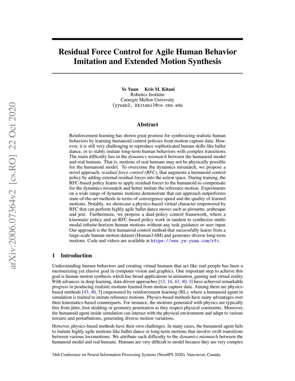 Reinforcement learning has shown great promise for synthesizing realistic human behaviors by learning humanoid control policies from motion capture data. However, it is still very challenging to reproduce sophisticated human skills like ballet dance, or to stably imitate long-term human behaviors with complex transitions. The main difficulty lies in the dynamics mismatch between the humanoid model and real humans. That is, motions of real humans may not be physically possible for the humanoid model. To overcome the dynamics mismatch, we propose a novel approach, residual force control (RFC), that augments a humanoid control policy by adding external residual forces into the action space. During training, the RFC-based policy learns to apply residual forces to the humanoid to compensate for the dynamics mismatch and better imitate the reference motion. Experiments on a wide range of dynamic motions demonstrate that our approach outperforms state-of-the-art methods in terms of convergence speed and the quality of learned motions. Notably, we showcase a physics-based virtual character empowered by RFC that can perform highly agile ballet dance moves such as pirouette, arabesque and jet\é. Furthermore, we propose a dual-policy control framework, where a kinematic policy and an RFC-based policy work in tandem to synthesize multi-modal infinite-horizon human motions without any task guidance or user input. Our approach is the first humanoid control method that successfully learns from a large-scale human motion dataset (Human3.6M) and generates diverse long-term motions. Code and videos are available at https://www.ye-yuan.com/rfc.