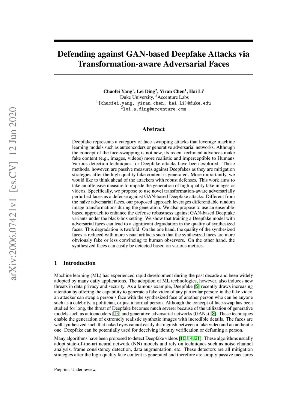 Deepfake represents a category of face-swapping attacks that leverage machine learning models such as autoencoders or generative adversarial networks. Although the concept of the face-swapping is not new, its recent technical advances make fake content (e.g., images, videos) more realistic and imperceptible to Humans. Various detection techniques for Deepfake attacks have been explored. These methods, however, are passive measures against Deepfakes as they are mitigation strategies after the high-quality fake content is generated. More importantly, we would like to think ahead of the attackers with robust defenses. This work aims to take an offensive measure to impede the generation of high-quality fake images or videos. Specifically, we propose to use novel transformation-aware adversarially perturbed faces as a defense against GAN-based Deepfake attacks. Different from the naive adversarial faces, our proposed approach leverages differentiable random image transformations during the generation. We also propose to use an ensemble-based approach to enhance the defense robustness against GAN-based Deepfake variants under the black-box setting. We show that training a Deepfake model with adversarial faces can lead to a significant degradation in the quality of synthesized faces. This degradation is twofold. On the one hand, the quality of the synthesized faces is reduced with more visual artifacts such that the synthesized faces are more obviously fake or less convincing to human observers. On the other hand, the synthesized faces can easily be detected based on various metrics.