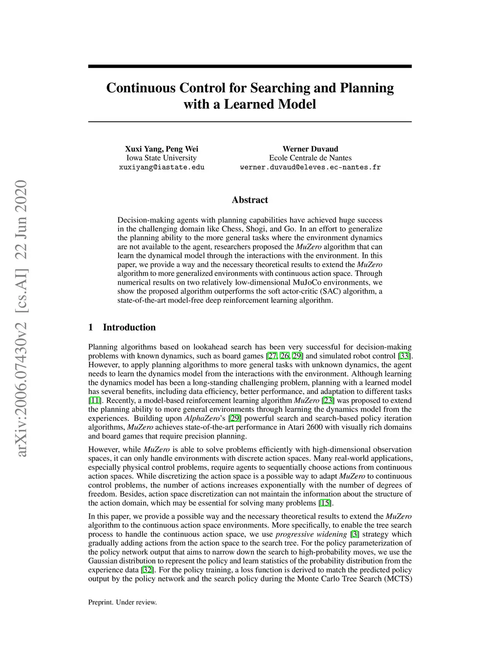 Decision-making agents with planning capabilities have achieved huge success in the challenging domain like Chess, Shogi, and Go. In an effort to generalize the planning ability to the more general tasks where the environment dynamics are not available to the agent, researchers proposed the MuZero algorithm that can learn the dynamical model through the interactions with the environment. In this paper, we provide a way and the necessary theoretical results to extend the MuZero algorithm to more generalized environments with continuous action space. Through numerical results on two relatively low-dimensional MuJoCo environments, we show the proposed algorithm outperforms the soft actor-critic (SAC) algorithm, a state-of-the-art model-free deep reinforcement learning algorithm.