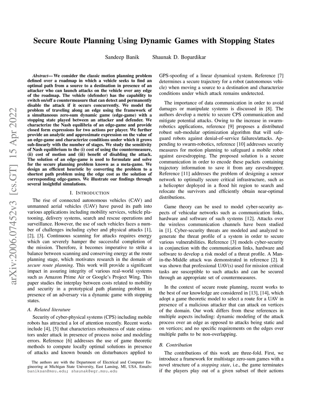 We consider the classic motion planning problem defined over a roadmap in which a vehicle seeks to find an optimal path from a source to a destination in presence of an attacker who can launch attacks on the vehicle over any edge of the roadmap. The vehicle (defender) has the capability to switch on/off a countermeasure that can detect and permanently disable the attack if it occurs concurrently. We model the problem of traveling along en edge using the framework of a simultaneous zero-sum dynamic game (edge-game) with a stopping state played between an attacker and defender. We characterize the Nash equiliria of an edge-game and provide closed form expressions for two actions per player. We further provide an analytic and approximate expression on the value of an edge-game and characterize conditions under which it grows sub-linearly with the number of stages. We study the sensitivity of Nash equilibrium to the (i) cost of using the countermeasure, (ii) cost of motion and (iii) benefit of disabling the attack. The solution of an edge-game is used to formulate and solve for the secure planning problem known as a meta-game. We design an efficient heuristic by converting the problem to a shortest path problem using the edge cost as the solution of corresponding edge-games. We illustrate our findings through several insightful simulations.