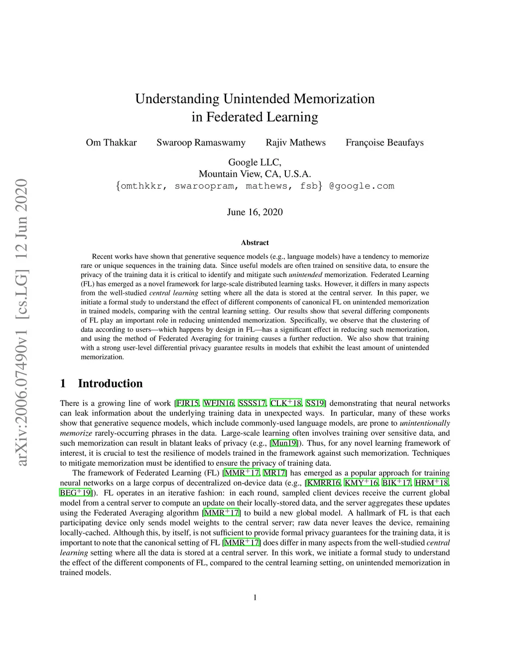 Recent works have shown that generative sequence models (e.g., language models) have a tendency to memorize rare or unique sequences in the training data. Since useful models are often trained on sensitive data, to ensure the privacy of the training data it is critical to identify and mitigate such unintended memorization. Federated Learning (FL) has emerged as a novel framework for large-scale distributed learning tasks. However, it differs in many aspects from the well-studied central learning setting where all the data is stored at the central server. In this paper, we initiate a formal study to understand the effect of different components of canonical FL on unintended memorization in trained models, comparing with the central learning setting. Our results show that several differing components of FL play an important role in reducing unintended memorization. Specifically, we observe that the clustering of data according to users---which happens by design in FL---has a significant effect in reducing such memorization, and using the method of Federated Averaging for training causes a further reduction. We also show that training with a strong user-level differential privacy guarantee results in models that exhibit the least amount of unintended memorization.